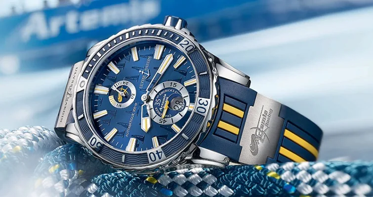 At first glance the dial is highly legible and not clustered or busy, just nicely laid out with superb symmetry. This Artemis Racing version mixes a gorgeous deep-ocean blue with splashes of Artemis Racing’s signature yellow. The 44mm case is a perfect size for this sporty piece, not too big to be dominant and yet big enough to have a real presence on the wrist. The ocean blue bezel shows minute indicators for the first 20 minutes then every 10 minutes like most diver pieces, the bezel also features Ulysse Nardin’s iconic wave pattern. Minute markers hug the outer edge of the ocean blue dial featuring an Artemis sailing boat motif with applied white indices with a thin yellow line through the middle. At 12 O’clock is the power reserve indicator with the Artemis Racing logo in yellow in the middle, directly below and keeping the symmetry exquisite is the small seconds counter with Artemis Racing Challenger America’s Cup’ inscribed inside reminding the wearer and anyone that looks that this is a commemorative piece. Also inside the small second dial Ulysse Nardin have inserted the date window to keep the clean crisp feel of the dial with black on white numerals.