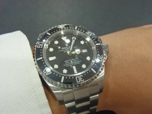 The width of the bracelet also plays a role. The Rolex’s lug width is 21 mm. To me, the Rolex appears slightly unbalanced. A 22 mm or 24 mm would have been better suited for the Deepsea. For more info, please visit rolex.com