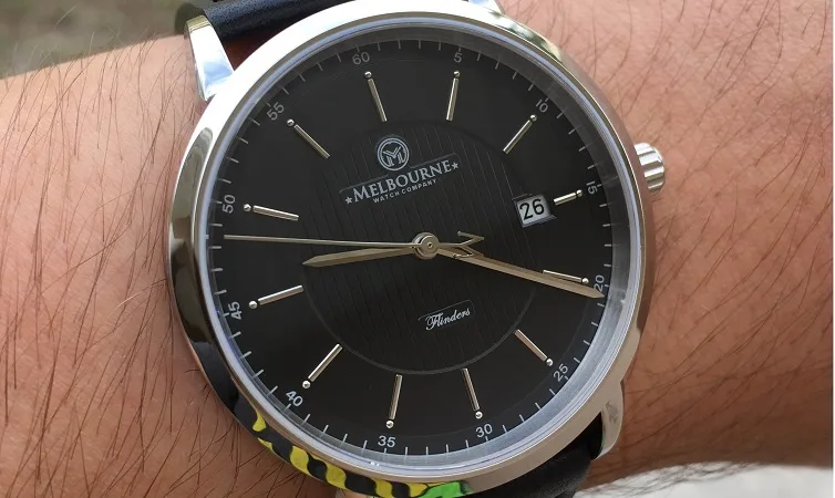 The cursive “Flinders” print is very small and so is the slightly larger logo towards the top. Tiny numbers remind onlookers of the minute and second indications while sitting next to even tinier stainless steel dots at the end of the hour markers. The multilayered dial is most impressive towards the center where an indention is met with vertical lines as well as the date window on the far right. The date window is an excellent accompaniment that is welcomed by me! Surrounding all of it is the stainless steel case that perfectly matches the hands and markers. A well put together face that ties together all around.