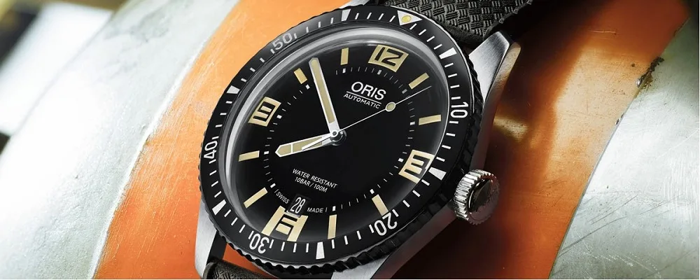 This watch uses an Oris calibre 733 which is an automatic movement that provides power for a seconds hand, minute hand, hour hand and a date window that you’ll see at 6 O’clock on the dial. If you’d like a little more info I can tell you that this movement is based on a Sellita SW200 “off-the-shelf” movement that’s been modified for purpose. You can’t see that movement however because it’s behind a screw down caseback with a vintage Oris shield logo on it.
