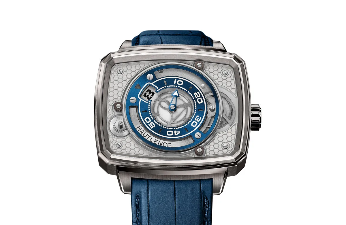 The dial on the watch in of itself is spectacular with the blued minute hand tipped with a white arrow complementing the silvered opaline disc featuring the skeletonised hours. Instead of the hours jumping in a static window, the Swiss watchmakers from Hautlence went for a mobile window, supported on three bearings and featuring an off-centre weight. Here, the hour numeral is displayed thanks to the effect of gravity, but that’s just part of the unique charm of this watch.