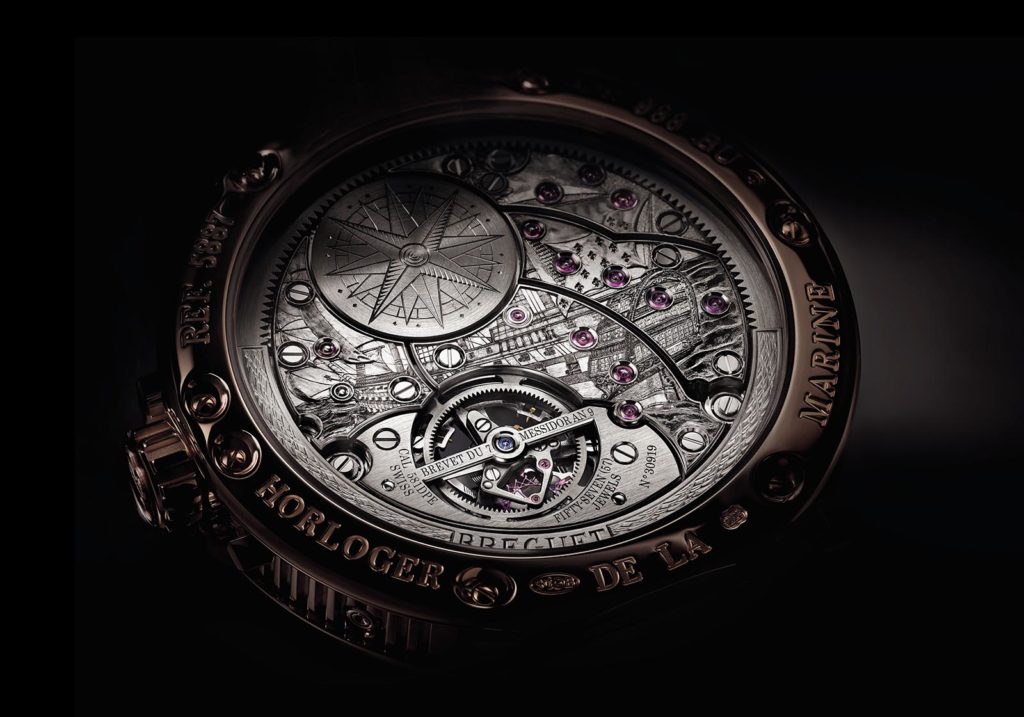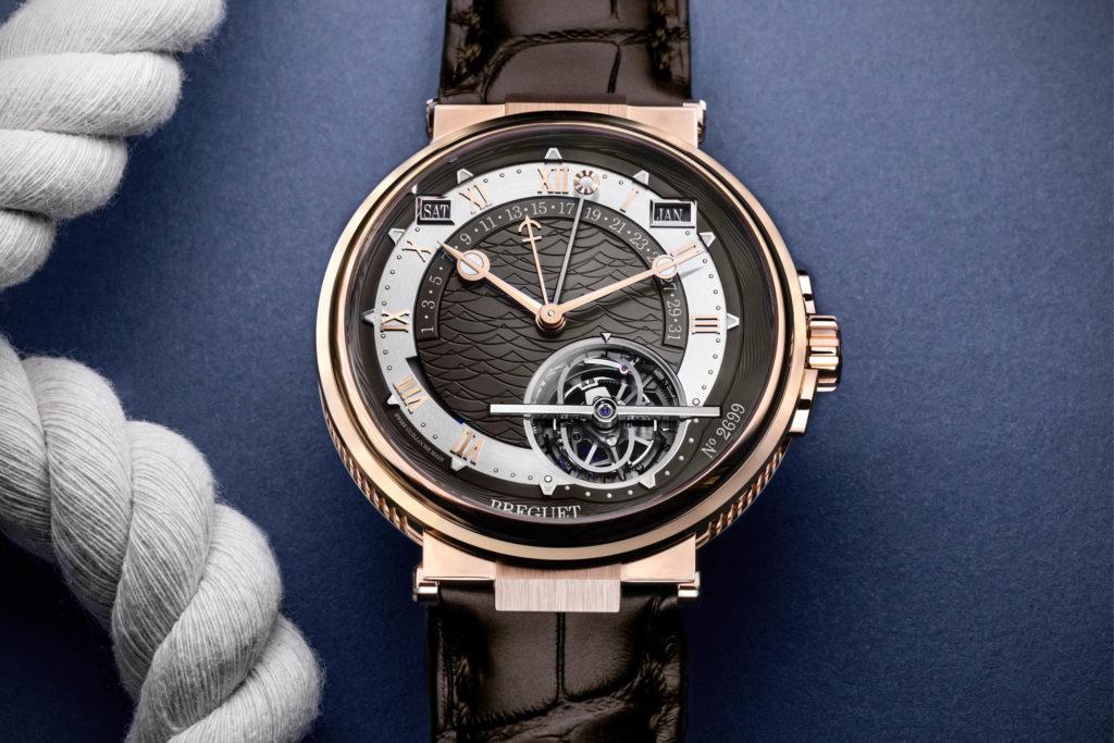 The movement has a nautical theme to it to add some whimsy to this timepiece. The engraving on it is of the Royal Louis, built in 1758 she ended her voyage in a dry dock, being dismantled after some damage there was irreparable, beats being sunk by the British I guess. Orbiting the Louis is a peripheral rotor to keep the calibre 581DPE ticking for up to 80 hours. There’s also silicone technology onboard, and of course, the EOT and perpetual calendar functions added. Strip away those extras, and you get what is essentially the 581DR calibre used in Breguet’s stand-out ultra-thin tourbillon models.Â