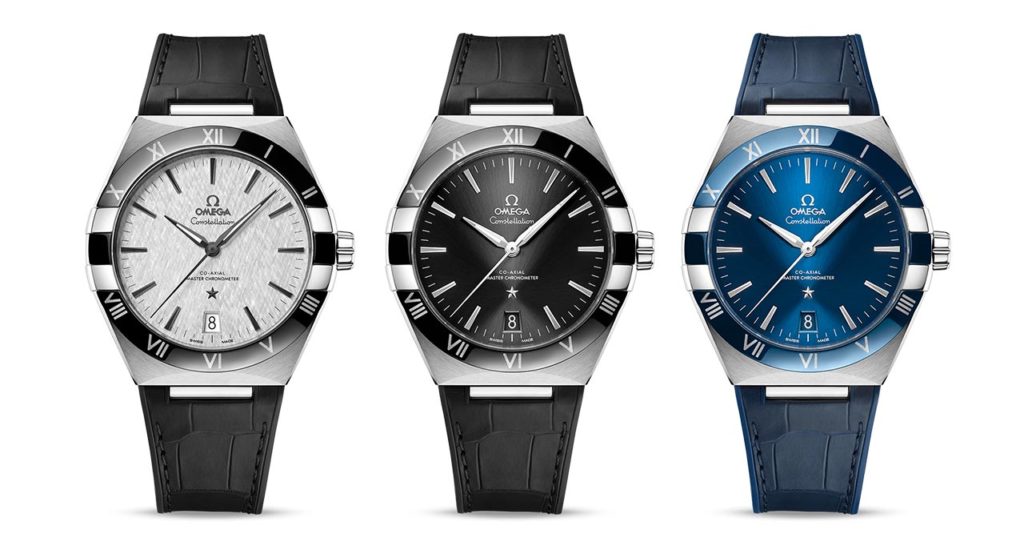 Omega has given us a variety of options with the new Constellation range. You can have the case in either stainless steel, 18k yellow gold or 18k Sedna gold (Omega’s proprietary gold alloy which has the colour of rose gold and yet will not fade or tarnish over time). You also have an array of silver, black or blue dials with the different metals, and the silver dial in steel can also be had with a steel bezel instead of ceramic if that’s your thing. All of these watches will accept straps designed for the 39mm Constellations too. It doesn’t appear that any bracelets have been announced yet, so that could be a good option if you’re desperate for the touch of cold hard metal, you naughty savage. The rubber straps also have an antibacterial coating on the inside to stop the, well, you know, the smell.