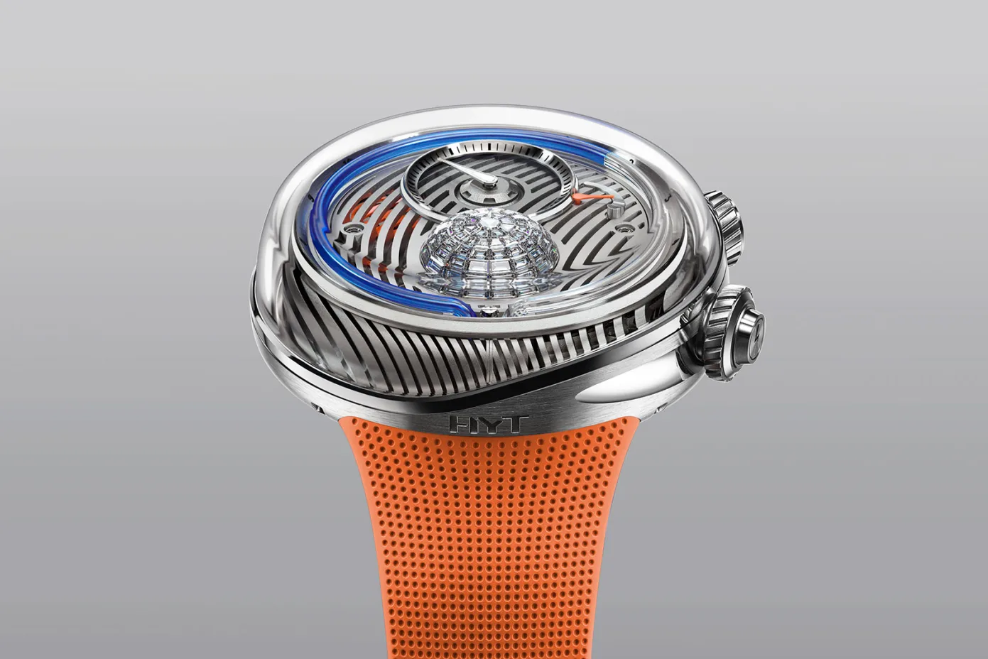 If you’re after the version with the red strap (ref H02593), then you get a futuristic ring (which HYT is calling the Vortex)on the dial below the subdial displaying minutes. Light also seems to glow from underneath the ring surrounding the lone minute hand and from the edge of the case making for one spectacular light show. If that wasn’t enough, the version on the orange rubber strap (ref H02464) comes with a set of 73 brilliant baguette-cut diamonds forming a dome over the Vortex light to add even more glitz to the show.