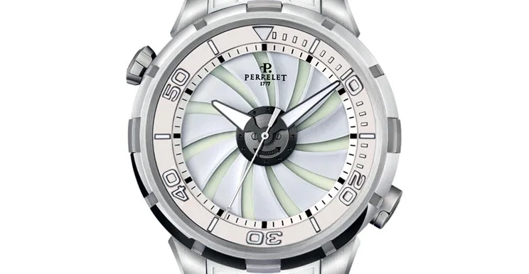 The Turbine Diver White is housed in a 47.5 mm-diameter steel case, water-resistant to 300 metres and specifically designed for this collection. The fluted case middle features four claws attached to the bezel, while the integrated winding crown is offset at 4 o’clock, symmetrically positioned in relation to the rotating bezel control. Dive times are measured via a rotating inner bezel ring on which the average 20-minute time stands out clearly thanks to a play on volumes. This function is controlled at 10 o’clock via a user-friendly crown equipped with a locking system.