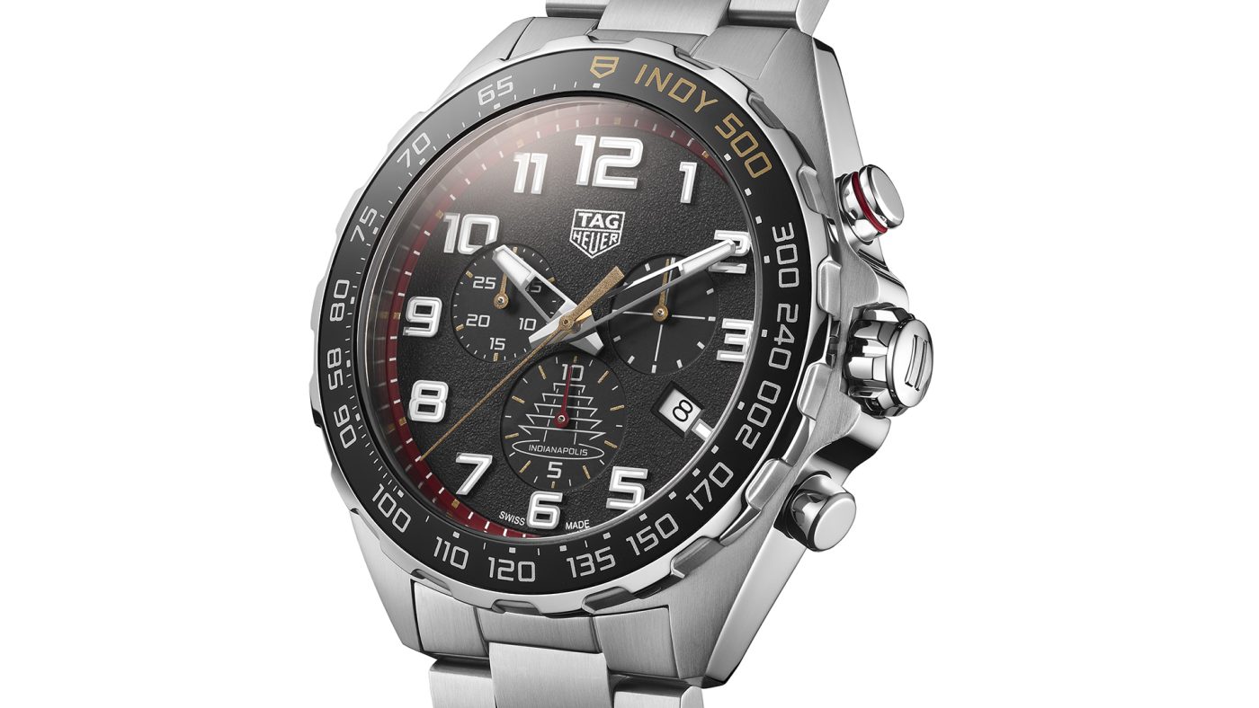TAG Heuer Formula 1 Indy 500 2022 Limited Edition is paired with a three-row brushed stainless steel bracelet with a steel folding clasp and a double safety system with a pilot extension. It’s limited to 500 pieces and has an MSRP of $2,400.