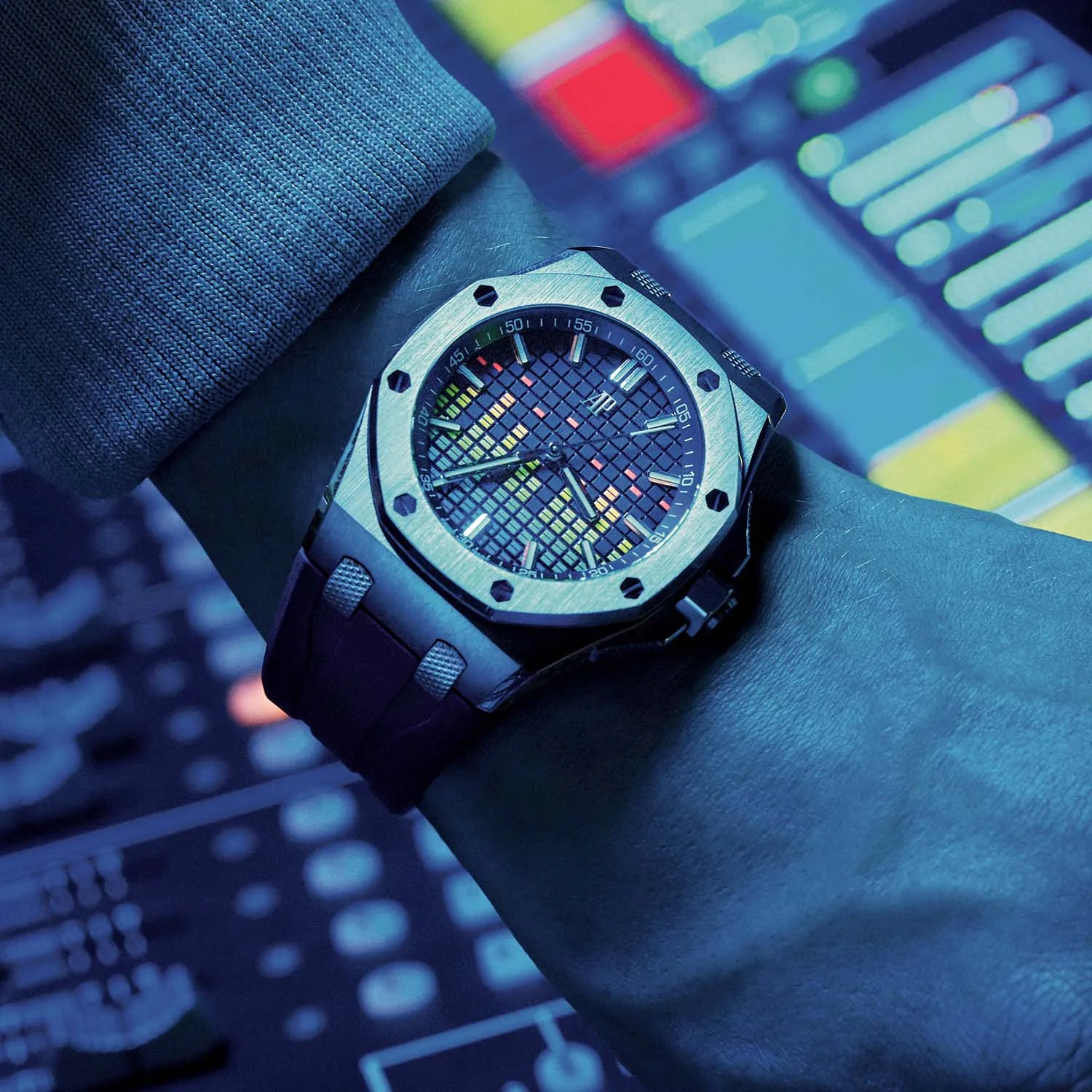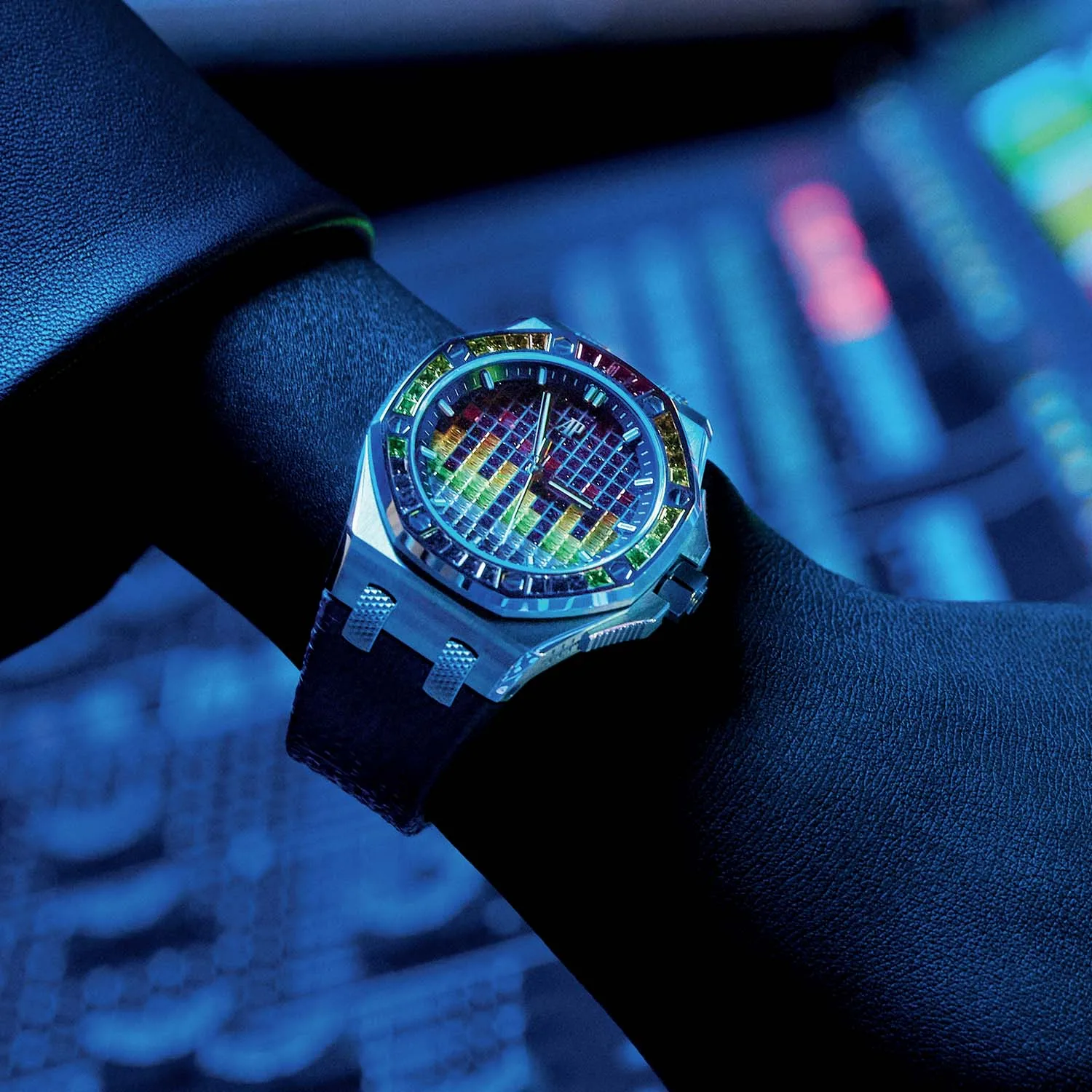 Five Music Editions are coming out, and they feature some of the things you might not see at a club unless you’re backstage. For example, the crown guards have been replaced by the faders you’d see on a mixing desk. The four lug connectors which give the Royal Oak its distinctive flair have been engraved with a clous-de-Paris reminiscent of audio jacks. The most apparent detail, however, is the dial where the tapisserie has been used to recreate the appearance of an equaliser/VU meter display. This effect is different depending on the variant you buy. The titanium and ceramic models all have it painted on the dial, while the gold models use applied coloured gems for a dazzling display.