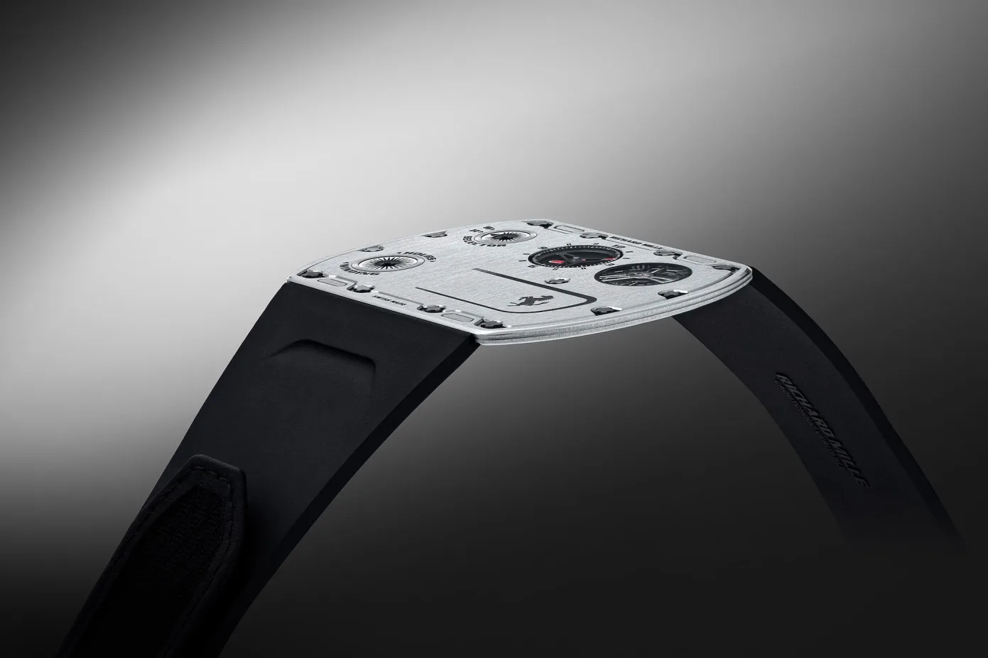 Unlike the prior two record holders, the overall appearance is rather unconventional (head on, anyway). It has a wide rectangular form with rounded sides (a tonneau shape) and the time aperture is very small in relation to the overall watch face. Hours and minutes sit in a central sub-dial at the top with the exposed balance at right, both protected with sapphire crystals. The watch celebrates a partnership between Richard Mille and Ferrari that started in 2021, so the Italian carmaker’s logo is naturally (and prominently) at the bottom.