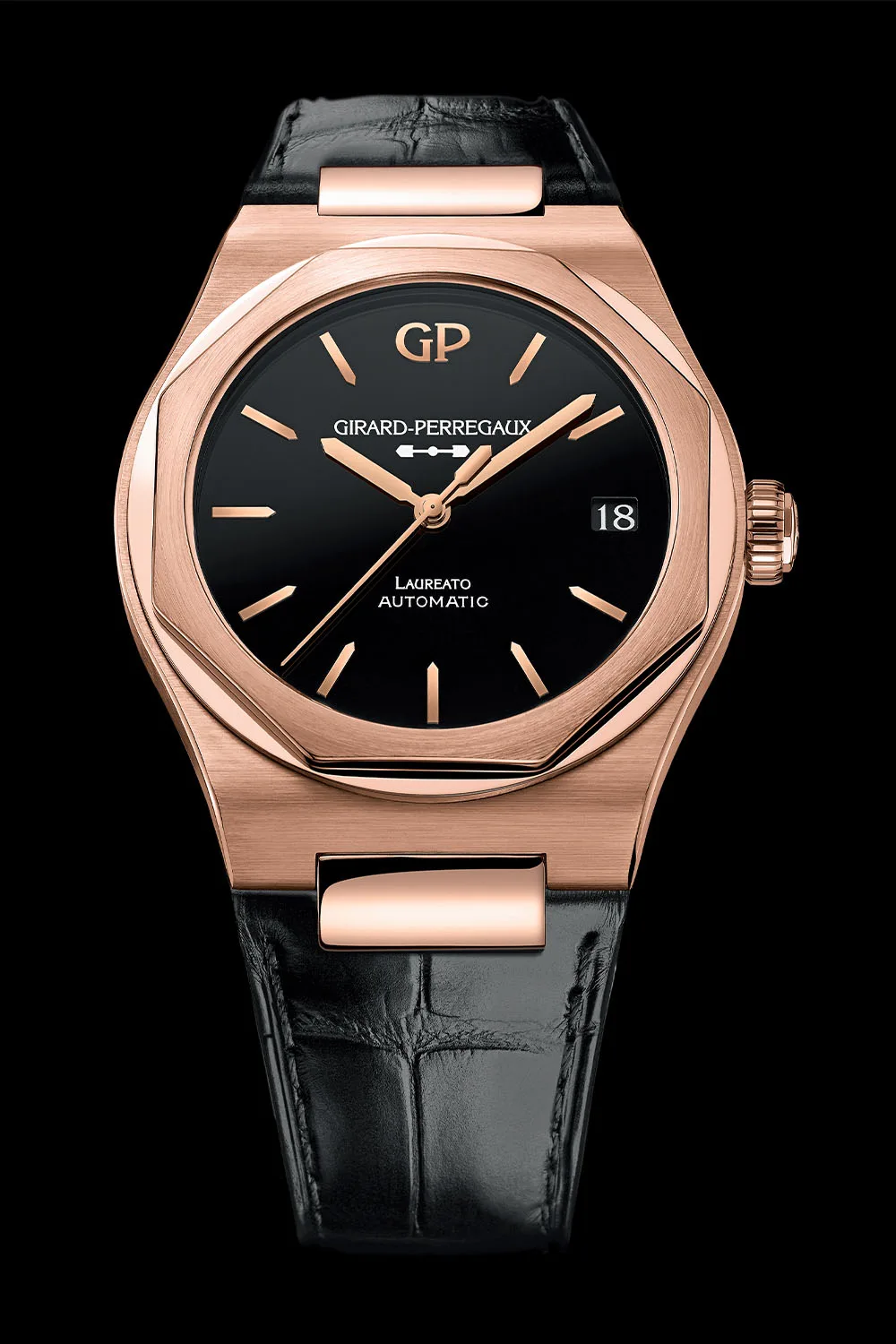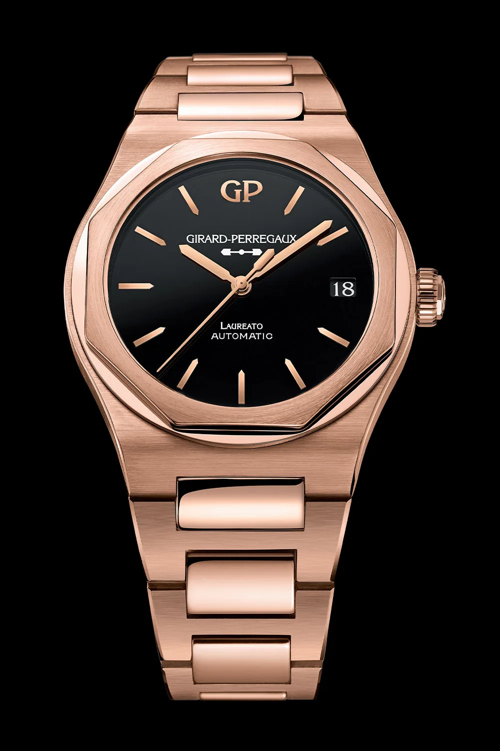 The Girard-Perregaux Laureato is one of the first luxury steel sports watches, introduced in 1975 and named after the Italian movie “Il Laureato,” or The Graduate. The Girard-Perregaux Laureato is a watch for watch connoisseurs, rather than a watch aimed for every wrist under the sun. Despite this, its octagonal bezel gives it a better recognition value than any other timepiece. Now Girard-Perregaux has just introduced the new Laureato 42mm 18k pink gold case model with an exquisite black onyx dial.