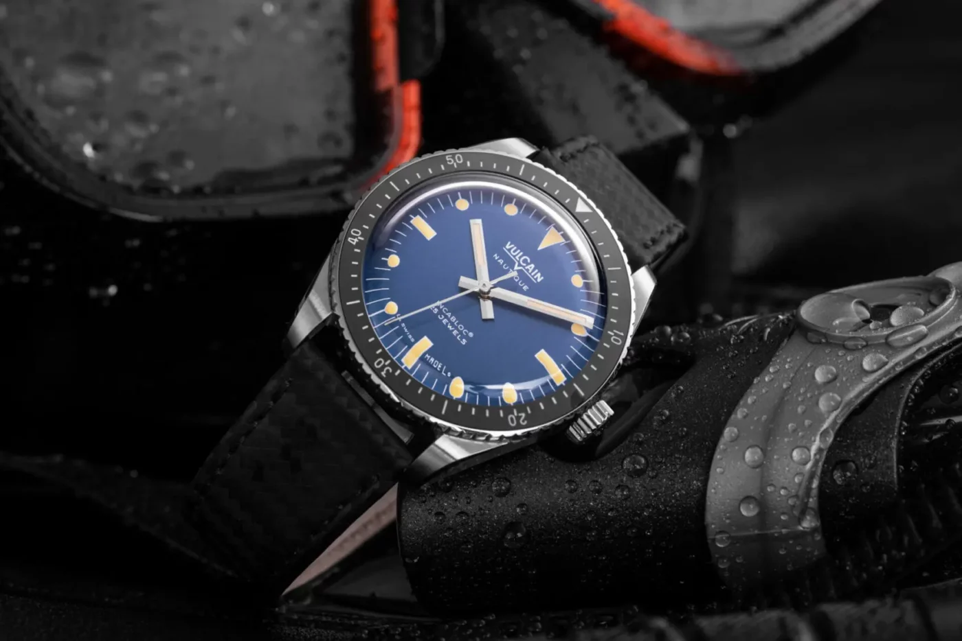 The Cricket may be Vulcain’s most recognisable model, but this new Nautique 38mm skin diver-style watch is inspired by a model from 1960. It features a thin unidirectional dive bezel and a clear dial for easy reading. Small markers help with the clean look, as do the sharp stick hands. SuperLumiNova is also in use to provide easy reading in the dark, which is essential for a diving watch. Vulcain is offering either a black or vertically-brushed blue dial So too is the water resistance, which is 200m thanks to the 38mm stainless steel case. We think it looks quite similar to some Oris models, although those are also historically inspired.