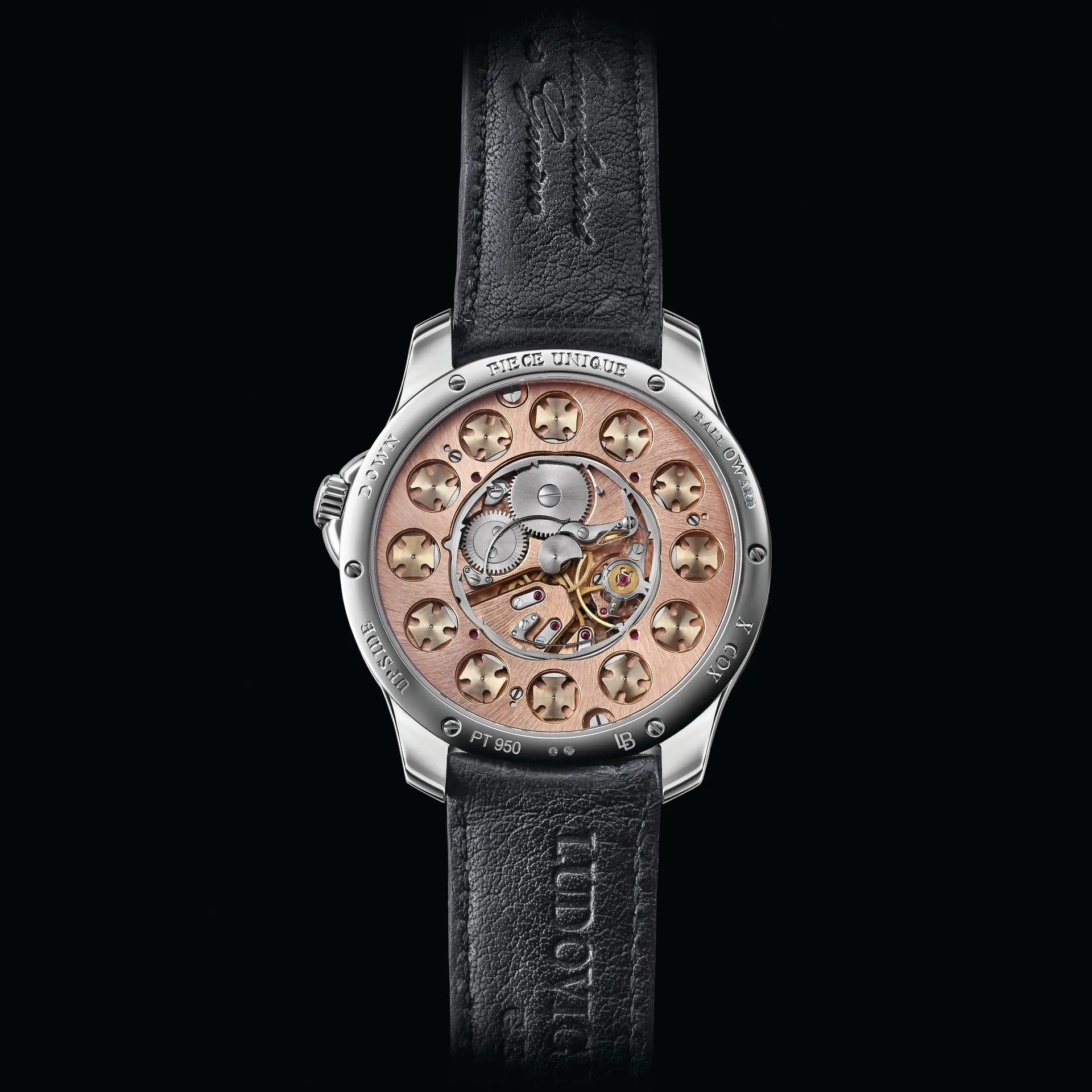 The 41mm x 11mm platinum case showcases the artistry and precision that defines Ballouard’s work. With water resistance up to 30 meters and a sapphire crystal front and display back, the case offers a perfect window into the heart of the timepiece.