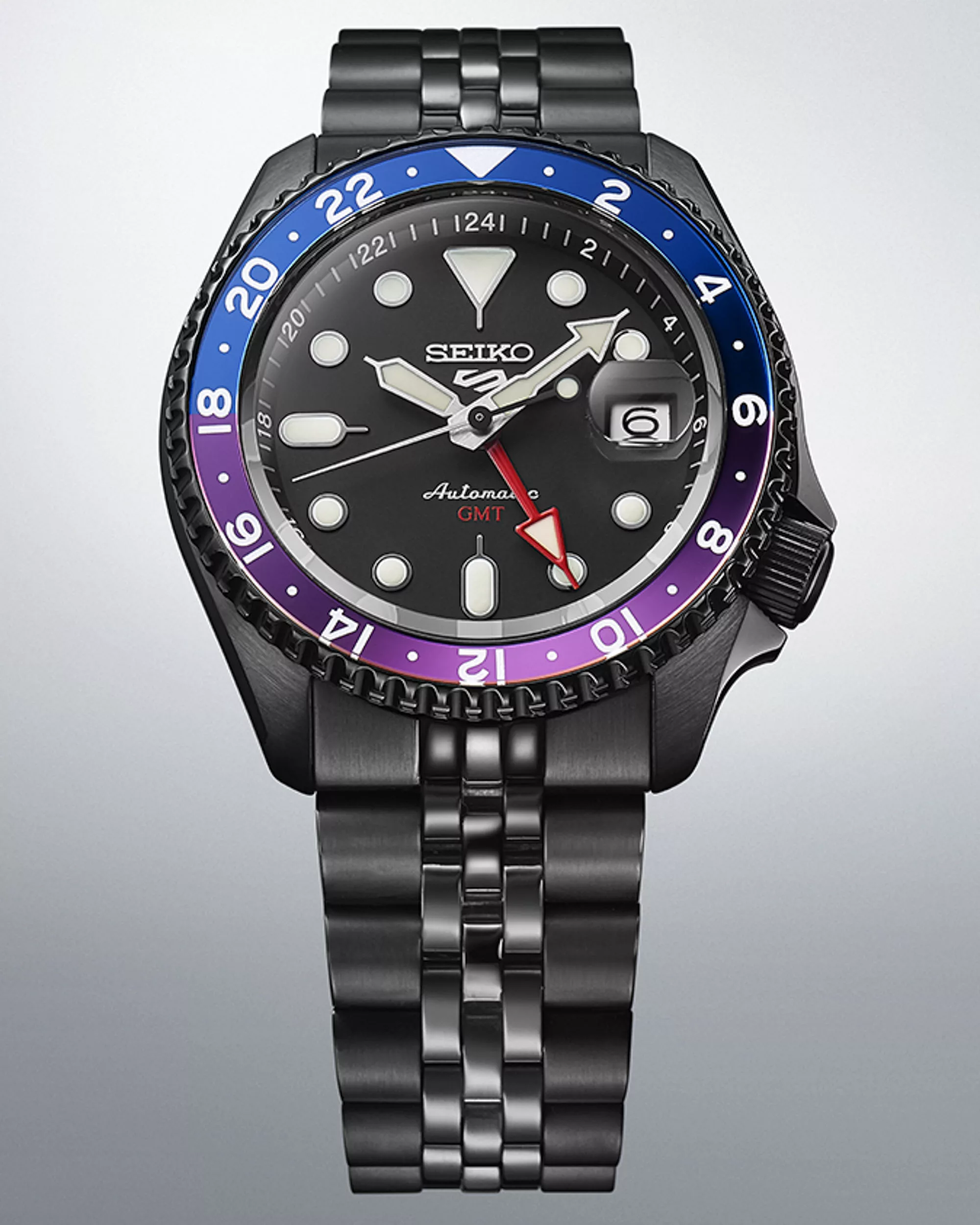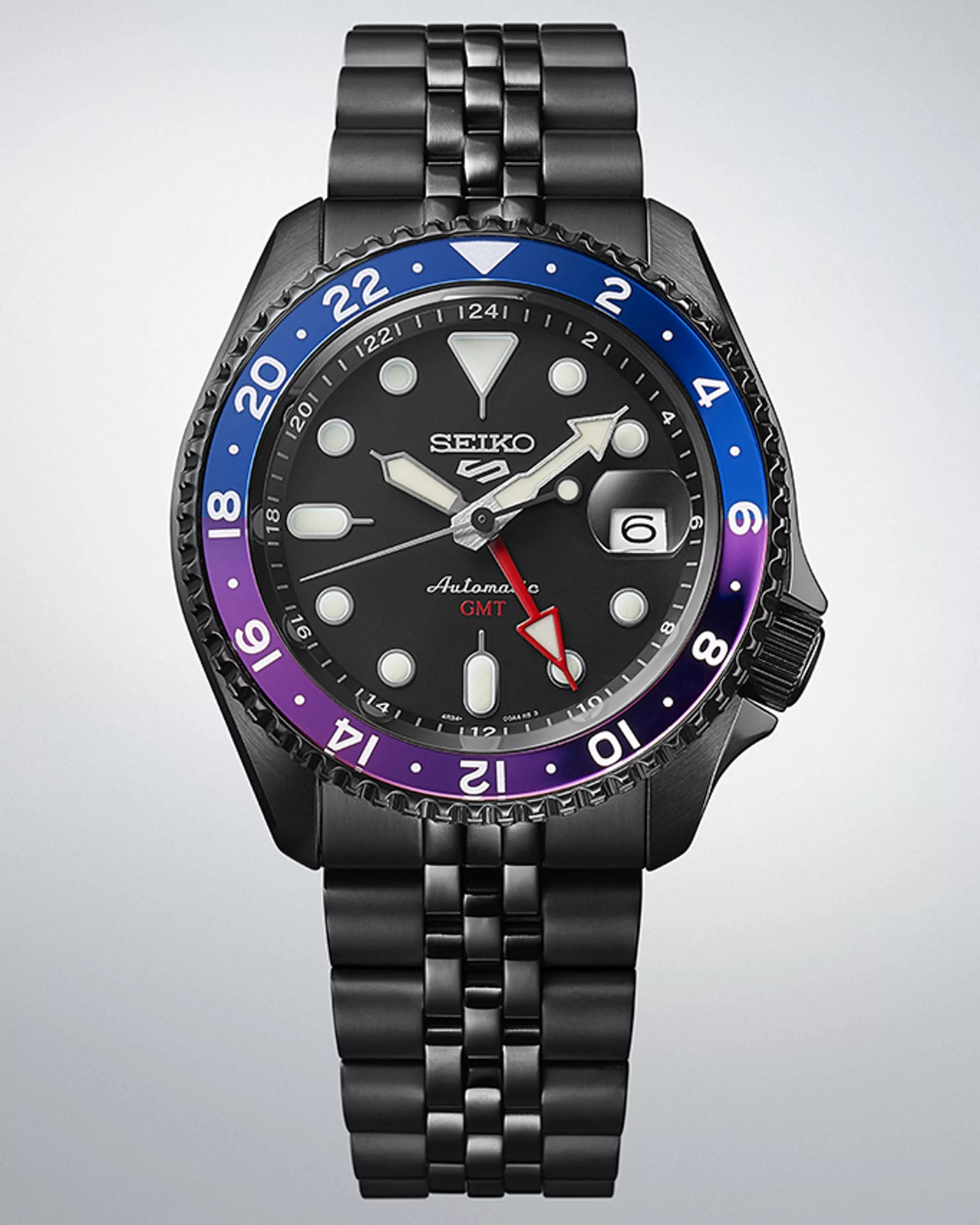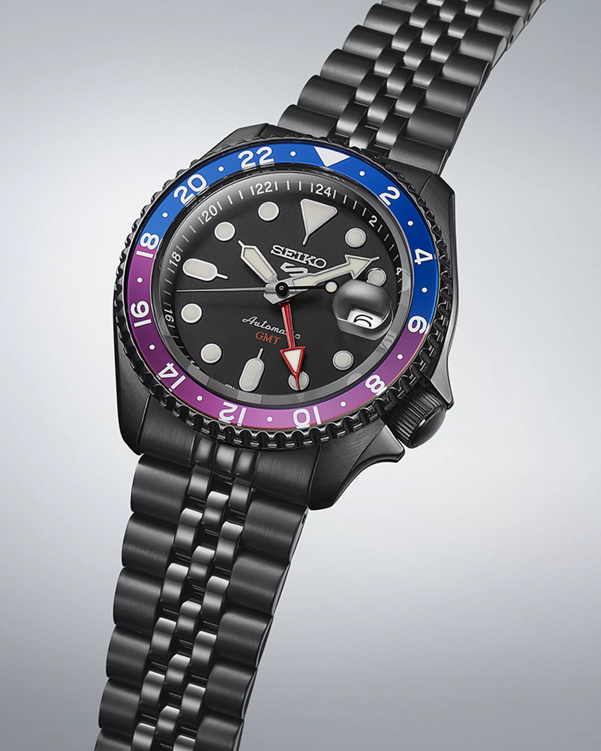 The dial of the SSK027 retains the matte black surface seen in standard Seiko 5 Sports GMT models. Luminous hands and hour markers ensure visibility, and small bright red accents highlight the 24-hour hand and “GMT” text. The unique split-color bezel insert in navy blue and purple quite apparently pays homage to Tokyo’s sunset. The bezel’s captivating fusion of blue and purple against the stark black of the dial, case, and bracelet mirrors the enchanting hues of Tokyo’s cityscape as it surrenders to nightfall. The watch is water-resistant up to 100 meters, and the Hardlex crystal with a magnification bubble above the date enhances durability.