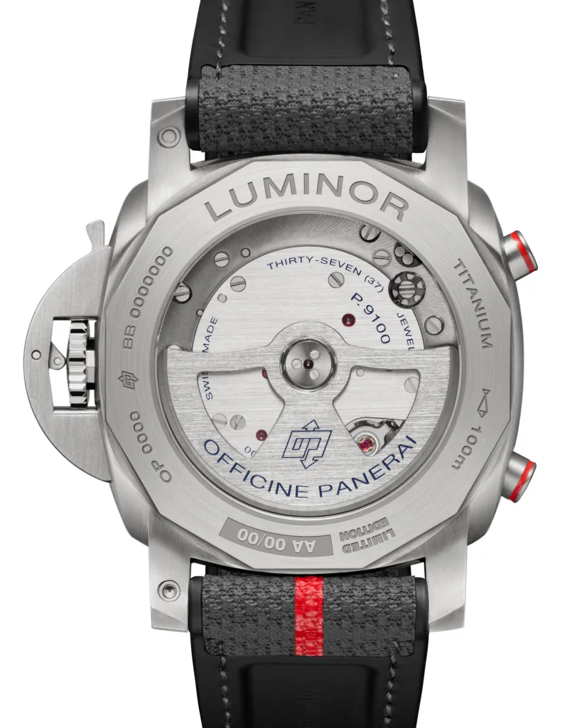 The other piece is PAM01654, it follows the same ideas design wise with its grey sandwich dial and its bi-material rubber and textile strap. The case of this new one also measures 44mm, but on this one it’s made of titanium with a titanium bezel, caseback and clasp. Water resistance is kept at 100m. Inside this watch is the P.9100 and it’s made in-house by Panerai.