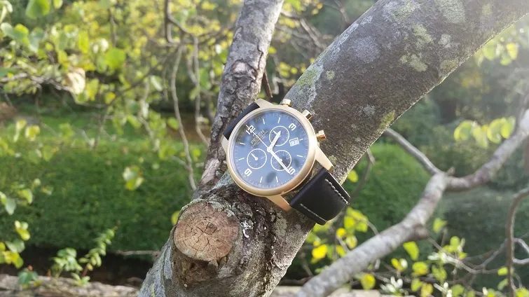 It’s with great delight that I get to present to you this watch, the Peren Chronograph in gold. This watch is a quartz based pseudo sports watch, I use the term pseudo because this watch isn’t quite a traditional dress watch, or it would be a three-handed affair, and it’s not quite a sports watch or it would be on a bracelet (there is a bracelet version of this watch available in steel from the Peren website).