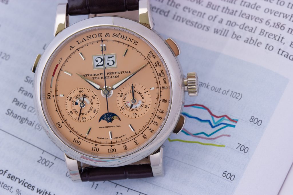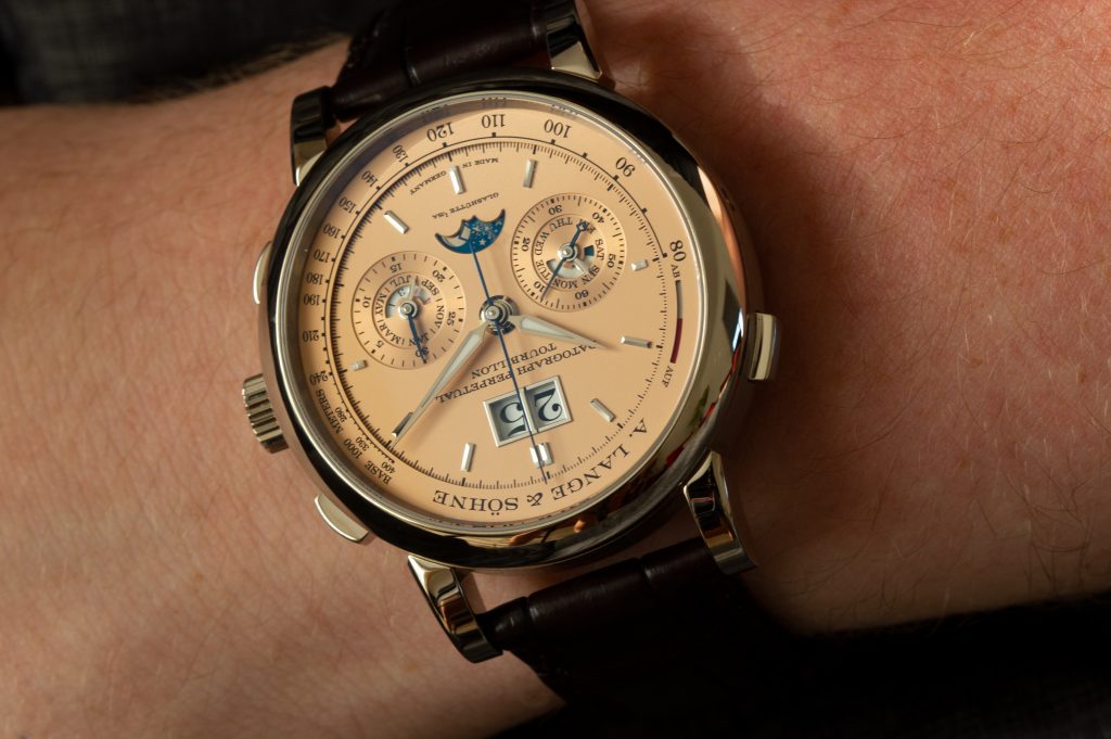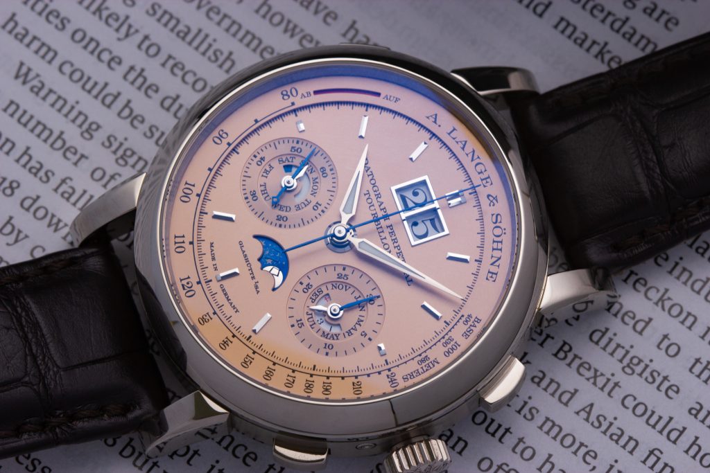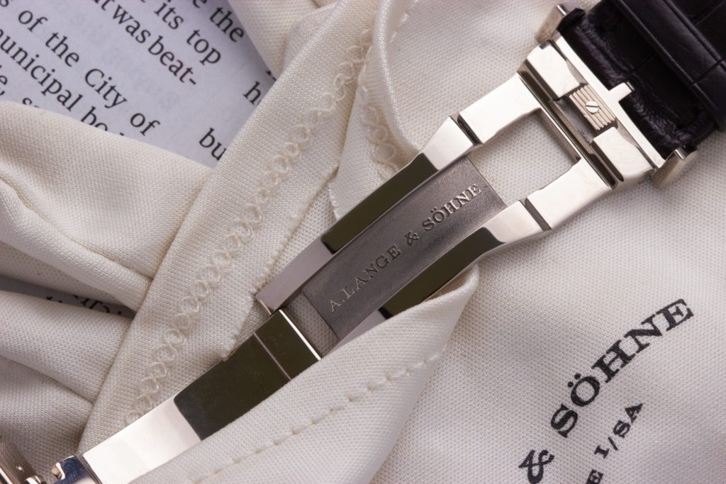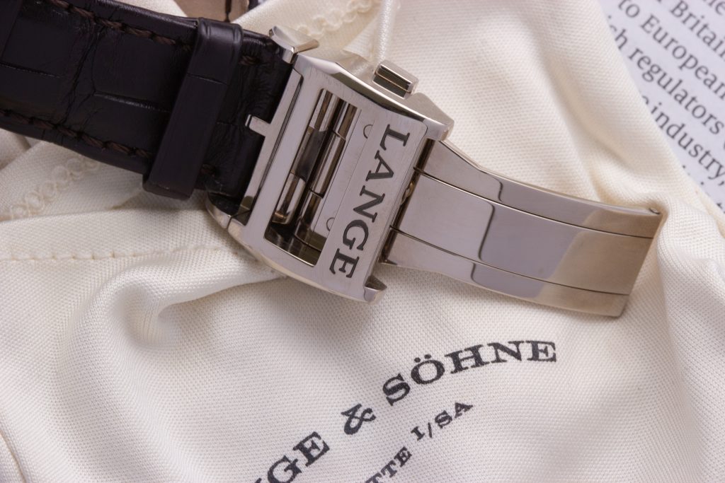 That’s not to say that the watch is cumbersome, far from it, the strap firmly holds the piece in place on the wrist, and you can have confidence in the solid gold twin pusher folding clasp. Don’t expect to wear this and not notice, though, as I’ve said in countless articles on A.Lange & Söhne watches before, their complicated watches are meaty. Compared to Swiss watches which tend to have an elegant lightness to them, the Datograph Perpetual Tourbillon has a solidity brought on by the large dimensions and the sheer mass of the thing. According to our patented VSS (Very Scientific (kitchen) Scales), this watch weighs in at 171 grams, for reference, this year’s GMT Master 2 BLNR from Rolex weighs 142 grams, and you can feel the heft thanks to the white gold case and clasp.