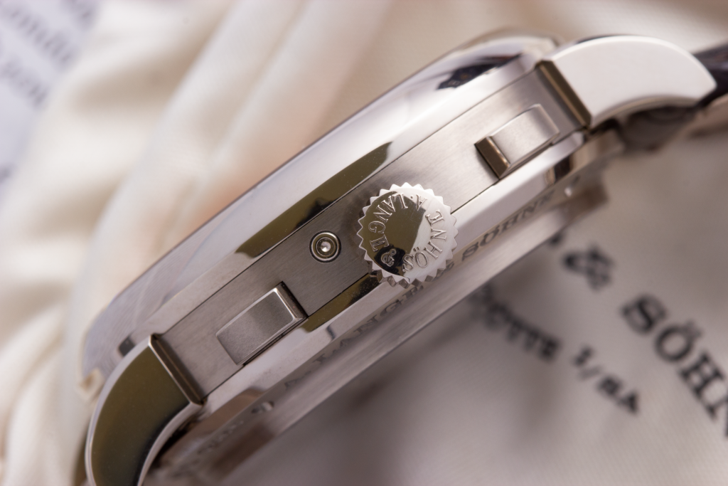 The power reserve is displayed on the edge of the dial using a red and white bar, which is new for this line. It is 50 hours in total. The Datograph Up/Down has the power reserve on a small hand in the middle, but in this case, a moonphase is in the way. Also, the calibre L952.2 has a protective device which deactivates the pusher for the Outsize Date when the crown is in its normal position. You may know that A. Lange & Söhne drew inspiration from the clock in the Semperoper, the opera hall in Dresden, for its Outsize Date, any watches which have this have a pusher to control the date independently. In this case, advancing the date also advances the perpetual calendar, but the watch still has some small push-pieces on the sides of the case should you need to re-synchronise all the displays. I had to do it once during my two weeks, and it was no bother at all. Just like the chronograph pushers, the date one can also be glimpsed through the caseback; its cutaway is right next to the beautifully engraved plate connected to the tourbillon bridge. Because the bridge is skeletonised, there wasn’t space to put the traditional engraving there, so it’s been relocated to the side for this watch.