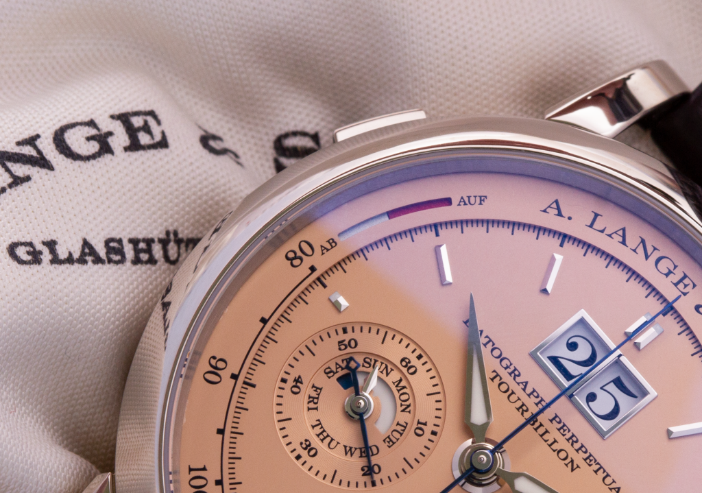 Photographing it was quite a challenge, I wasn’t sure whether a darker or lighter background would do the trick, so I settled on a mixture and grabbed my June 29th edition of The Economist and had a go. To be fair to A. Lange & Söhne (and myself) the salmon colour is exceedingly susceptible to changes in lighting conditions, even the press release photos change the hue of the salmon compared to mine which use a cool coloured light source diffused into a lightbox for the most part. You can see the colour change slightly in a couple of the wrist shots which were taken outside, and one with the evening sun shining directly on the wrist.