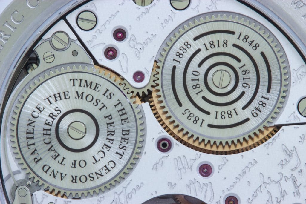 More references to Chopin can be found on top of the spring barrels. One barrel features a concentric timeline of the man’s life, with various years representing important dates from his birth to his death.