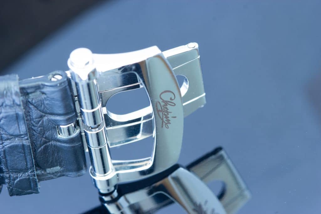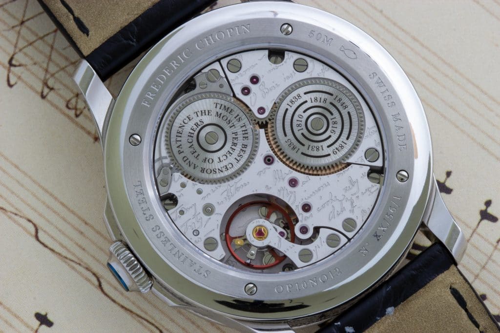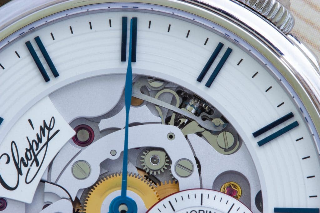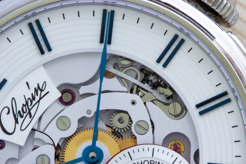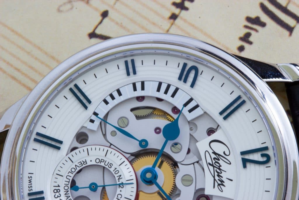 There are a couple of other nods to Chopin’s work on the dial, too. For instance, on the sub-seconds dial is the number ‘1831’, the year the Étude was published. The side edge of this sub-seconds dial is coloured red, it is made of a precious stone called carnelian and signifies the heart of Chopin which resides in a pillar of the Holy Cross church in Warsaw, while his body remains in Paris. Also, the markers on the dial are all stick markers except for 10 and 12 O’clock, which are Arabic to further hint at Chopin’s Opus 10 No.12 piece. The logo of the brand is also Frédéric Chopin’s signature. Closeup photography revealed that the marker for 11 O’clock has a portion of blue lacquer missing on it which can be seen in the photo above.