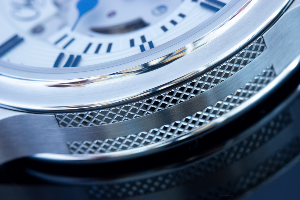 Perhaps the most interesting feature of the dial is the interplay of the different colours and finishes on show. The majority of the dial is white, with blue details such as the markers and hands, but some movement plates are visible as well with a grained finish on them. This contrasts with gears and screw heads which have been polished. Also on display is the mechanism for the crown, although you can’t see every cog, you still get an impressive view and the components have been polished up as well.