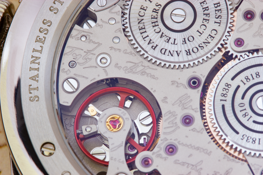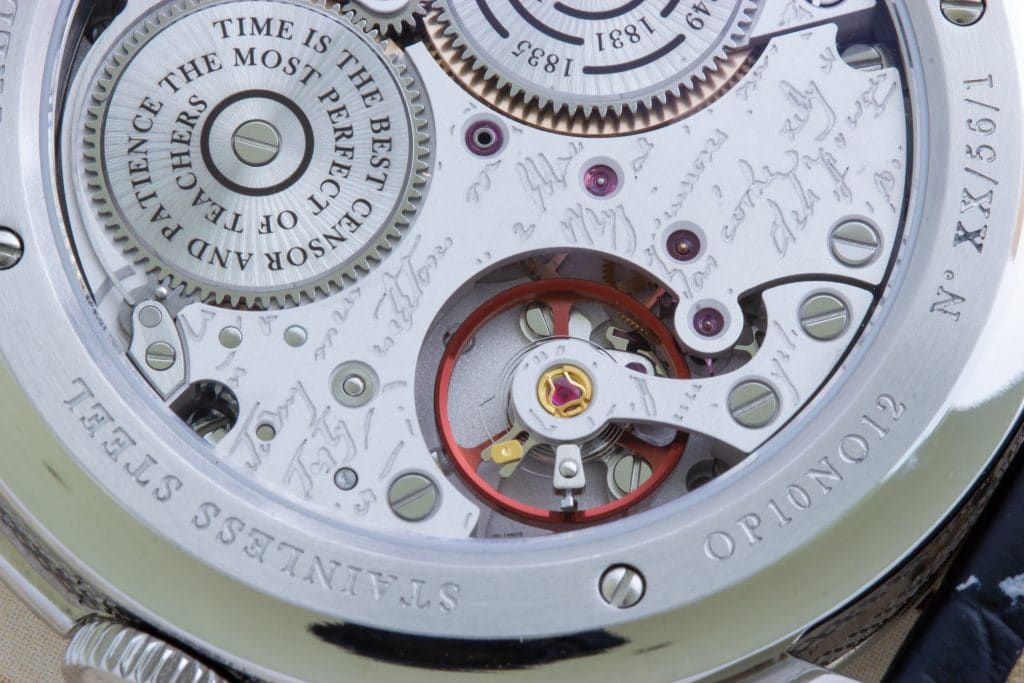 The other barrel has the phrase “Time is the best censor and patience the most perfect of teachers”, fitting for a wristwatch, really. The plates of the movement also have various scriptures of Chopin’s writing engraved on them. Due to the open dial, there isn’t actually a whole lot to see around the back, though everything is decorated very well and no surface is left untouched. Perhaps my favourite feature of the display movement is the hacking seconds of the movement. I’ve done a closeup of the arresting arm on a Grand Lange 1, but this one from Schwarz-Etienne goes a step further. It’s thick, chunky and polished, and you could almost miss it swinging out from its hiding place.