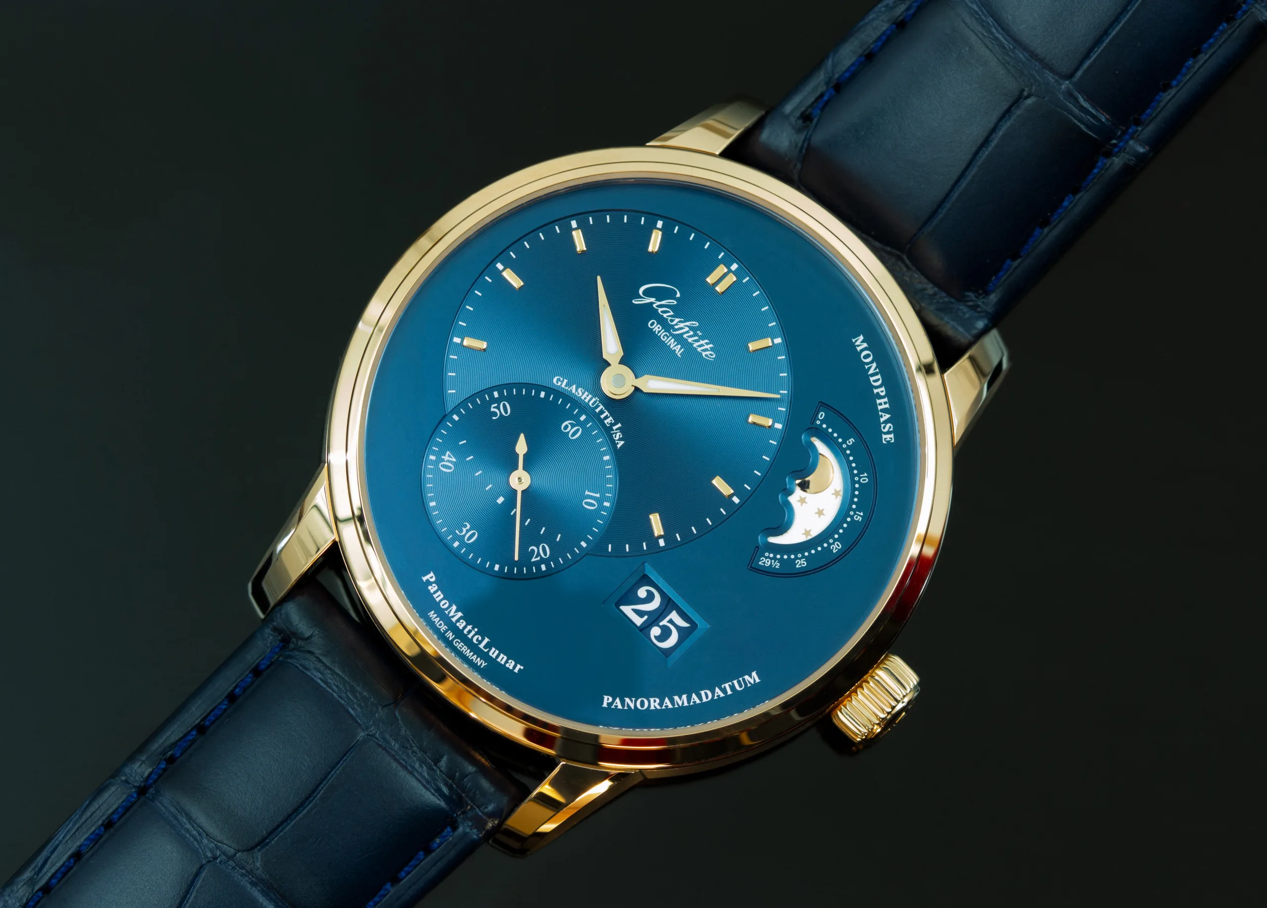 The blue dial is clear and crisp. Glashütte Original calls it galvanic blue, and it certainly stands out. It’s not as deep as you might expect, it shows up in a lot of the photos as a deep and dark, mysterious blue, but it’s lighter than that. It’s very susceptible to the lighting conditions at the time and the viewing angle, thanks to a subtle finishing on the parts that aren’t time dials. The dials that do display the time have their own circular guilloché which reflects light in another fashion, creating a part gold part blue shimmer that is quite attractive. The dial is made in Glashütte Original’s dial manufactory in Pforzheim where experts craft their elaborate and intricate dials.