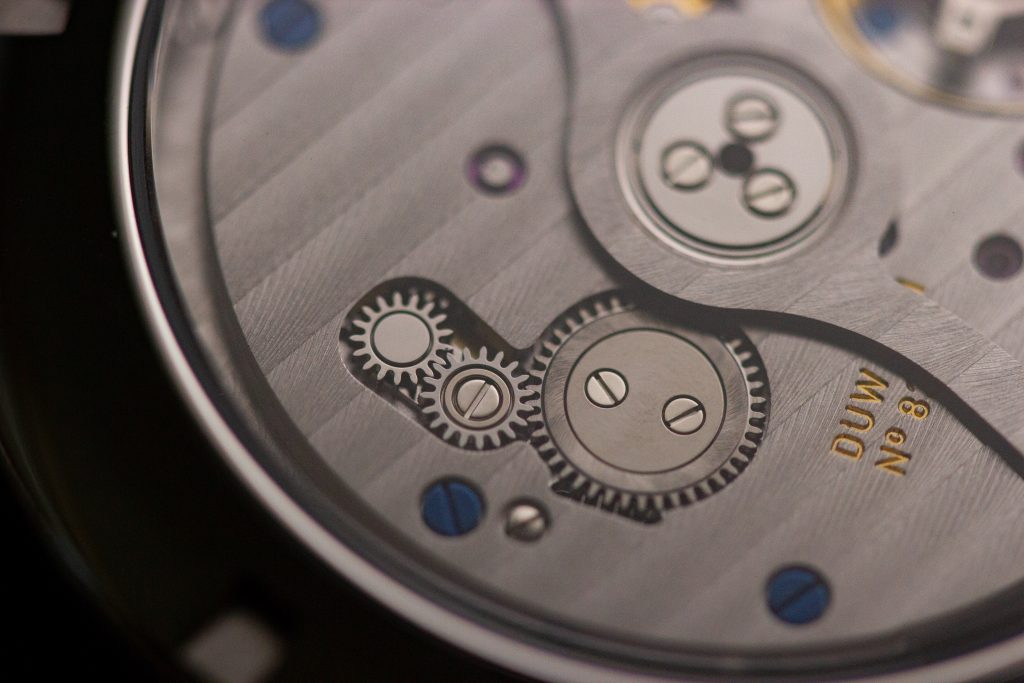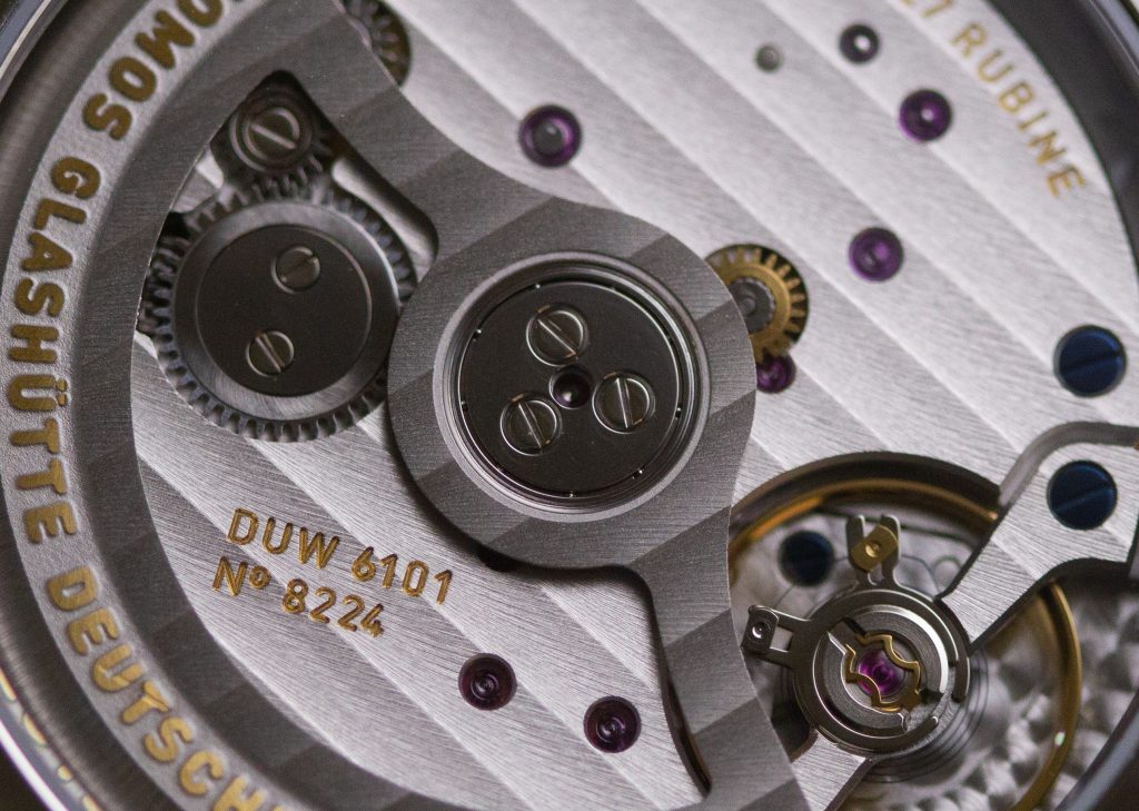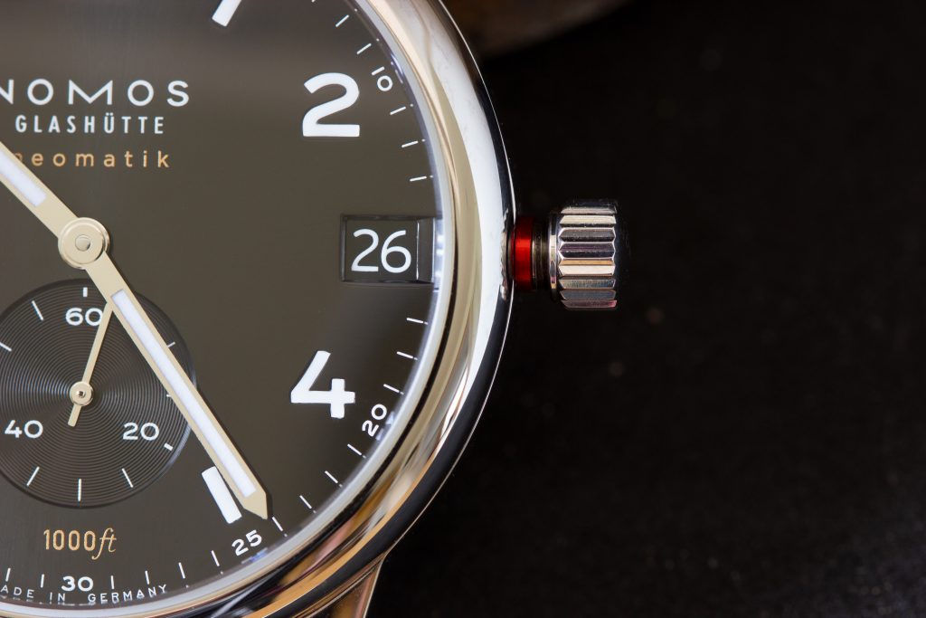 The DUW 6101 itself features intelligent German design, too. You may have noticed that on this watch the date is set on the very edge of the dial. Nearly every other watch with a date ring features the window closer to the middle, due to the date module being added on top of the existing movement. Here, the date has been integrated, so the ring is now placed around the movement rather than on top. It’s also a quickset date, unscrewing and pulling the crown out to the second position allows the wearer to change it forwards or backwards with ease and the window in which you cannot touch it while it changes the date is only 90 minutes. Consider that most watches require anywhere up to 6 hours to be safe. The cogwheels also received a new sliding gear to control them, which took eleven trials to perfect. There’s also a red danger ring to warn the owner that the crown is pulled out and therefore not water resistant.