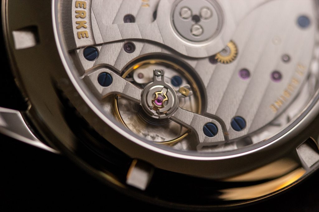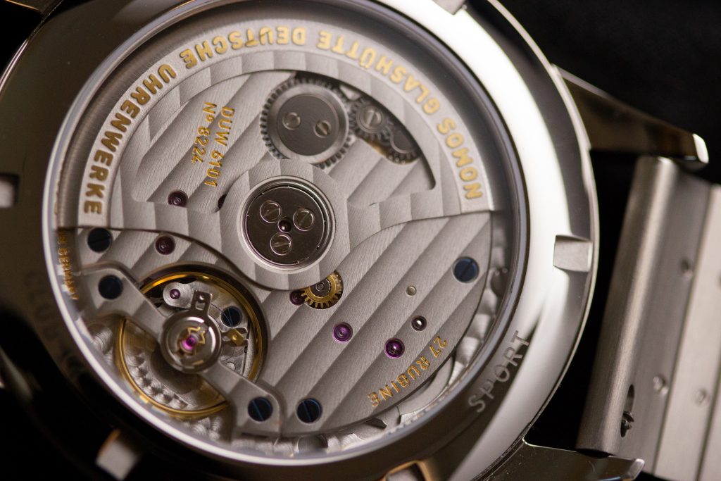 Let’s now take a closer look at the rear of the watch where the in-house made calibre DUW 6101 sits proudly on display. Exceptionally thin at 3.2mm, this movement features a spartan appearance, but it’s the details that make it shine. It doesn’t have complicated polishing, but the stripes that it does have are excellently finished with no irregularities. The automatic winding rotor has been skeletonised as well so that you can appreciate the finishing of the plate further. Small touches of gold here and there add contrast, along with the tempered blue screws. I’d also add a point which isn’t often seen nor discussed in publications such as this. As most people expect, a small amount of post-production editing goes into the photos here on WristReview, and we fully support it. Sometimes watch movements can build up small dust particles or bits of dirt here and there on the movements, but I would say this is the cleanest movement I’ve ever photographed that wasn’t from a super low production independent watchmaker.