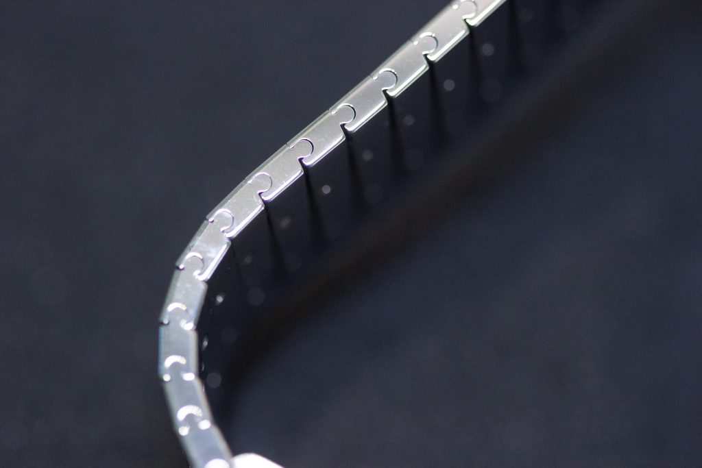 So, let’s get straight to the business of the new bracelet. It is a smart looking piece which has a few tricks up its sleeve. Assuming you haven’t purchased it from a physical shop, the bracelet should arrive attached to the watch but not connected at the clasp, leaving you to size it yourself. I had a little bit of fuss with it at first. The spring bar uses the same quick adjust system all the way through, so you need to squeeze both sides and slide it to the hole in the clasp that suits you best. It’s a bit fiddly compared to, say, the Glidelock system, but it keeps both cost and size down. The clasp itself is minimal in design, very thin with a polished foldover which is bound to attract scratches. Also, it’s upside down, or at least it seems to fold over upside down, I’m not quite sure of the intention of this But it’s no harder to operate and looks no different.