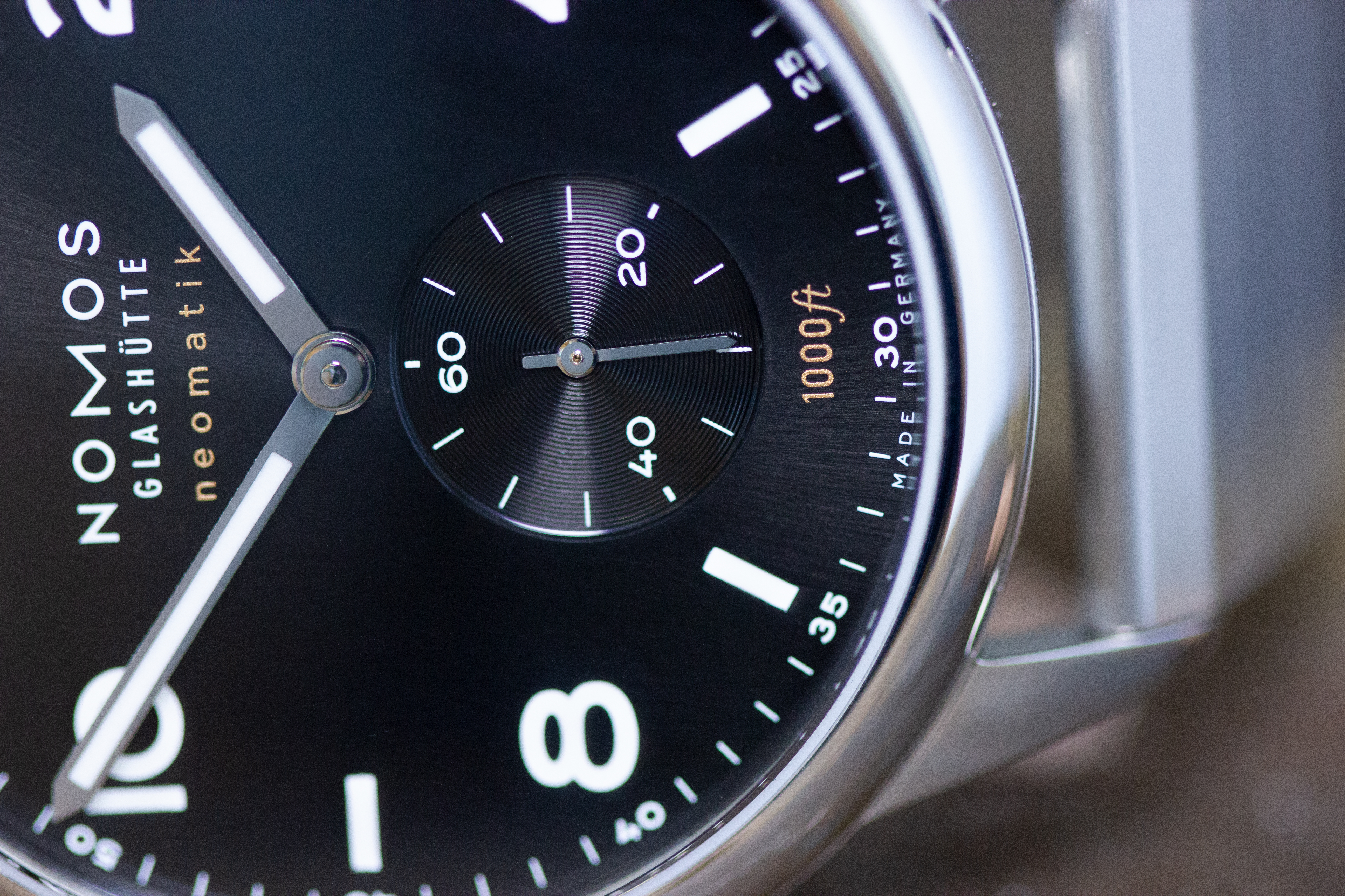 The dial is also well laid out with a sub seconds hand at 6 O’clock and the date at the usual 3 O’clock. The indicators are large and very legible from a distance — the white lume contrasting with the deep black well. At night, the lume is also a bright white and lasts quite a long time. It’s not up there with the brightness of diving watches, but it doesn’t need to be. Despite this watch having a water resistance of 300m, it has no diving bezel or functions. I expect this to be more of a posterity thing, or maybe even a hint at the future. Although this is meant to be a lifestyle watch worn by a younger person, 100m would have sufficed, so it’s nice to see Nomos going the extra mile here.