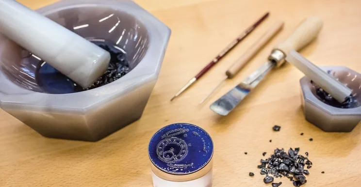 First, the raw material, a special sort of glass, is placed into a mortar and crushed and rubbed into tiny microscopic pieces by a pestle which enables it to be sieved.