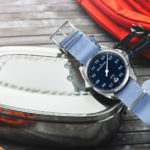 The strap is unique to the watch, featuring a faux aged finish with cracked surface matching the dial color. I like the vintage black calfskin leather with contrast stitching. Of course, it comes with a titanium buckle too.