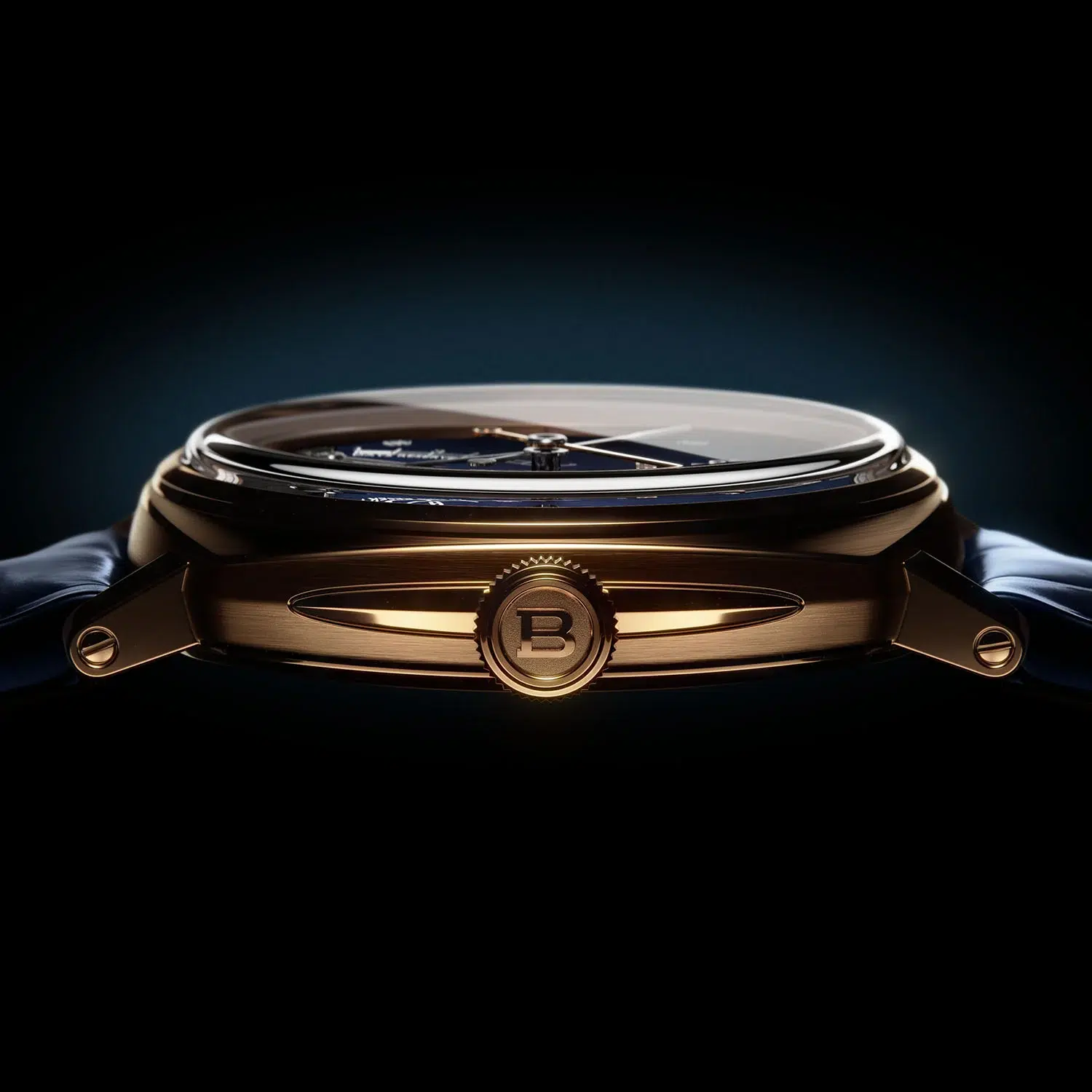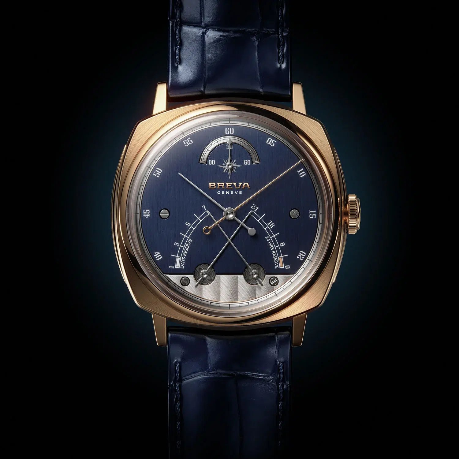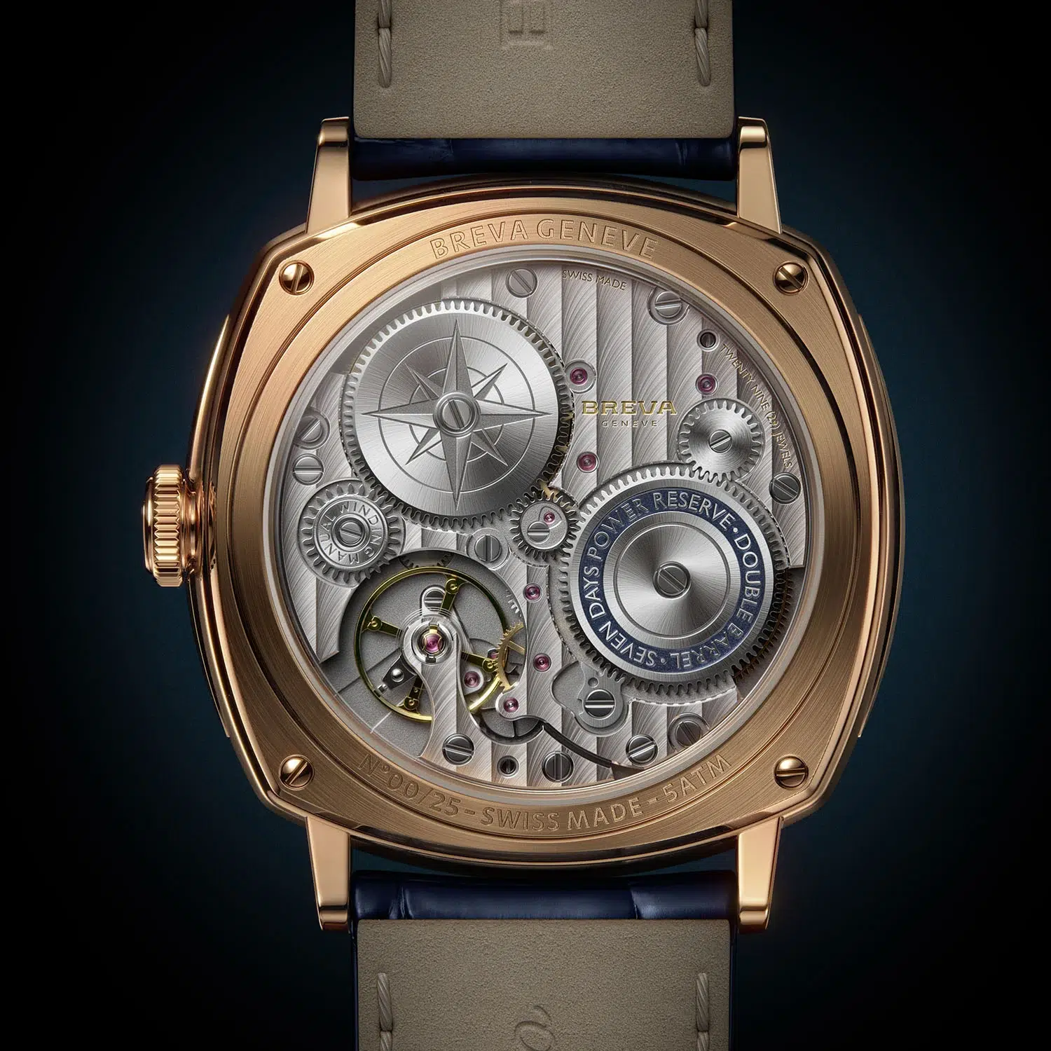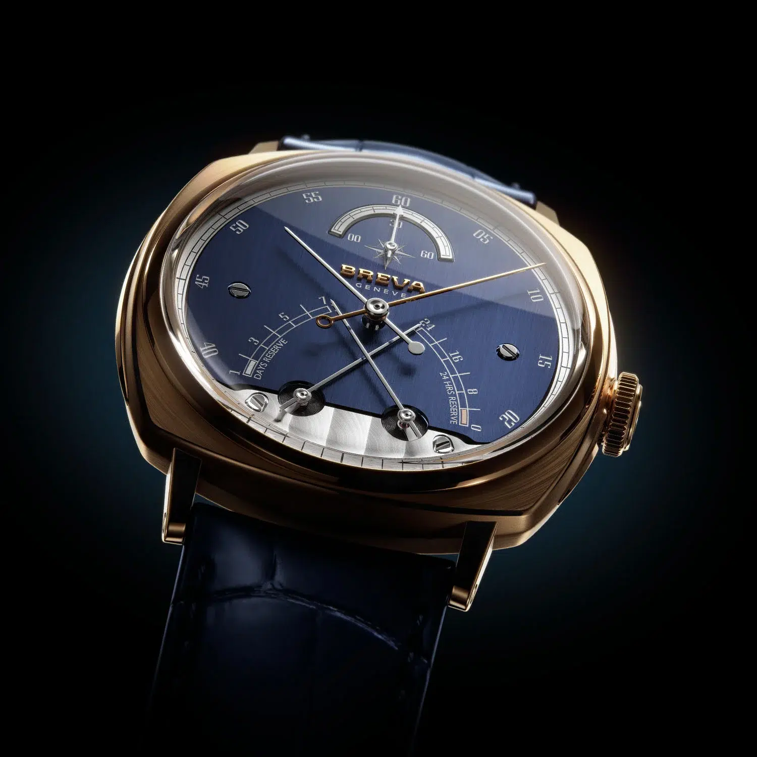 The first offering BREVA GENEVE has is called the Segreto di Lario. Influenced by the idea of a chilled-out day in the beautiful surroundings of Lake Como, Italy, the Segreto di Lario is an elegant watch to get going with. It’s got a cushion-shaped case made of 18k rose gold measuring 41.0mm x 11.1mm with 50m of water resistance. The dial is primarily blue with vertical Côtes de Genève finishing once again inspiring thoughts of Lake Como. Long and thin hands make up the watch display while keeping it restrained. At the top above the logo sits a retrograde seconds hand, while at the bottom sit its two power reserve displays. As this watch has a seven-day (168-hour) power reserve, it features a reserve indicator showing the days and another one accurately counting down the last 24 hours of its run time. It’s pretty handy for a manually-wound watch to have that, and the ‘crossed swords’ look of the hands brings unique charm in a good way. It’s a far cry from Breva’s Génie 03 from the mid-teen years; that thing looked a bit too wild.