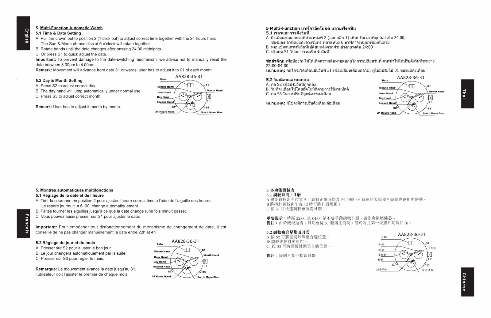 The crown is at 3 o’clock and there are three pushers at the 2, 4 and 8 o’clock positions. Below is a snapshot the instruction manual in 4 languages (to view clearer, click on the photo for a full blow-out).