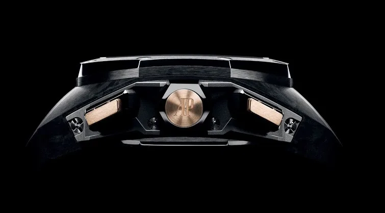 The Royal Oak Concept Laptimer measures 44mm in diameter and is finished in forged carbon. It also features some very intricate and beautiful finishings including black ceramic and 18 carat pink gold screw-locked crown, black ceramic and 18 carat pink gold screw lock crown, black ceramic and 18 carat pink gold pushpiece, black ceramic Laptimer pushpiece with the iconic Michael Schumacher logo, titanium pushpiece guards and a titanium caseback. The case is then finished off with a curved anti-reflective sapphire crystal on the dial with a display caseback also implemented and finished in sapphire crystal.
