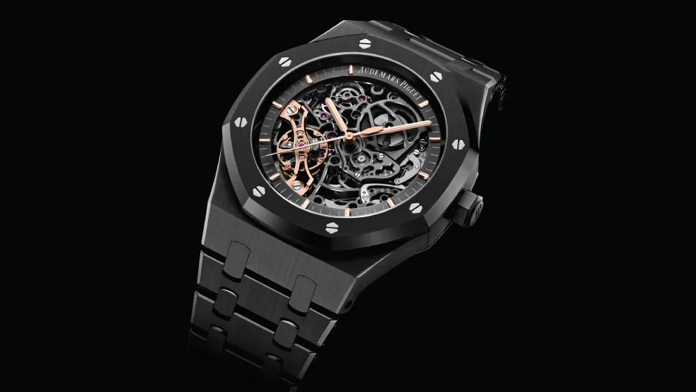 The case and the bracelet of this watch are made from black ceramic. A ceramic case is not that unusual in the watch industry today, many manufacturers have done this, but a ceramic bracelet is quite the rarity (even though we recently showed you the Girard Perregaux Laureato ‘Ghost’ which also comes on a ceramic bracelet). Audemars Piguet has, quite rightly, chosen black for this one, it ties in with the dark tint applied to the movement, or what’s left of it.