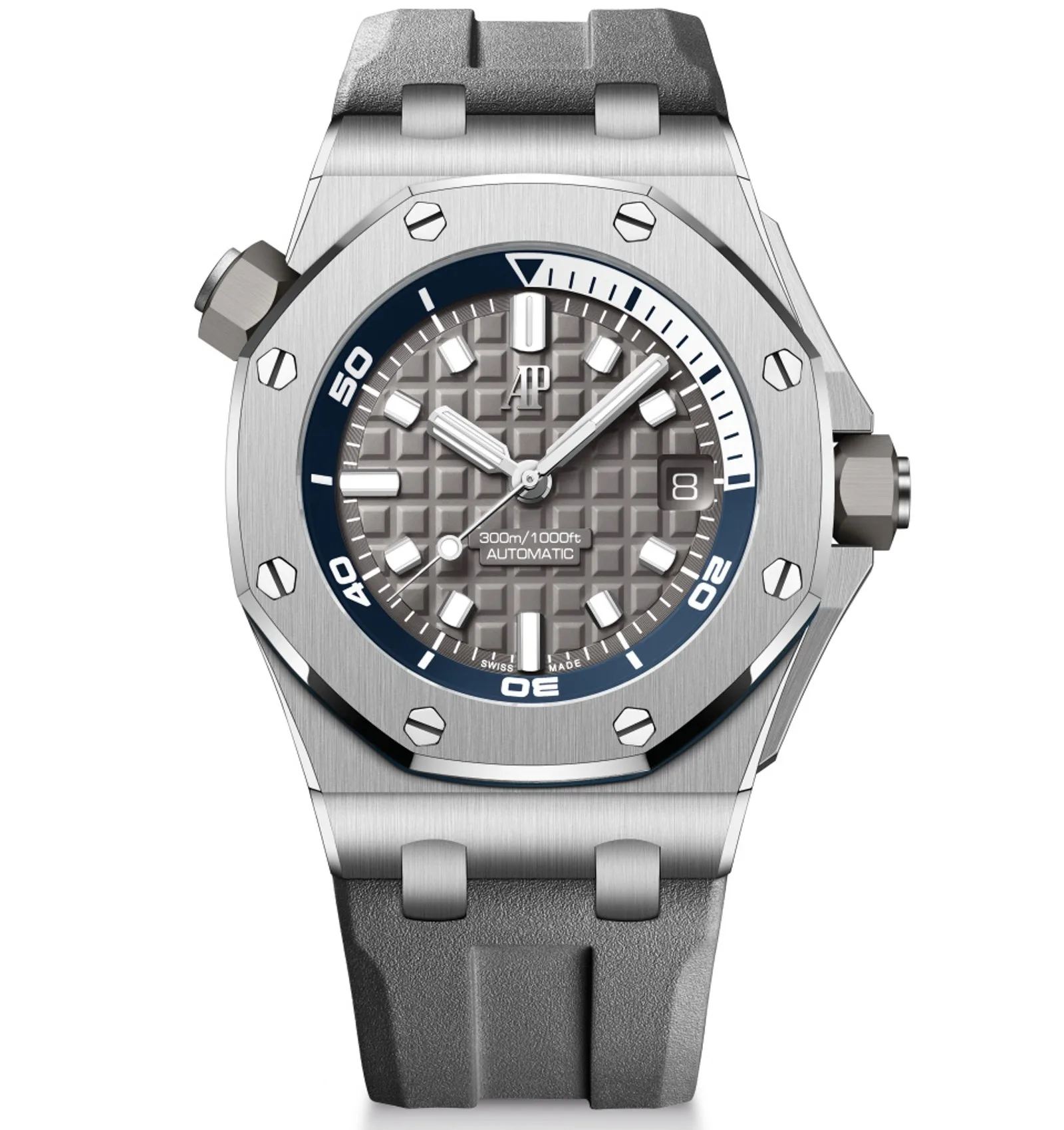 Audemars Piguet is offering the watch in only three colour variants to start. There’s blue on blue, featuring a blue dial, bezel and strap. There’s khaki on khaki, which is the same combination but a different colour (and gold hands and caps for the ceramic crowns), and there’s blue on grey, which features a grey dial and strap with a blue inner-rotating bezel. No black on black option yet. Maybe that’s because it was the most popular and they need to shift the stock of colours they have. I may have made that up, though.