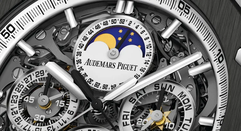The Royal Oak Offshore was born in 1993. This model, an ultra-sporty and virile extension of the model designed two decades earlier by Gérald Genta, has become an icon within the luxury world. 20 years on, this watch is now being enriched for the first time ever with an exceptional Grande Complication movement. Its mechanical self-winding heart houses four advanced functions, three of which were chosen as belonging to one of the three groups that form what are known in trade jargon as “classic complications”. In practical terms, in addition to providing a standard time display, this contemporary and eminently masculine watch 44 mm-diameter makes it possible to perform timekeeping operations and to read off intermediate or “split” times thanks to the addition of a split-second complication. Its amazingly charismatic titanium and ceramic case also houses a minute repeater mechanism, a rare complication serving to chime the hours, quarters and minutes on demand. And as if all that were not enough, the watchmakers have also added the perpetual calendar complication that is keenly appreciated by connoisseurs. As its name implies, it provides a perpetual display of calendar indications, as well as of lunar cycles.