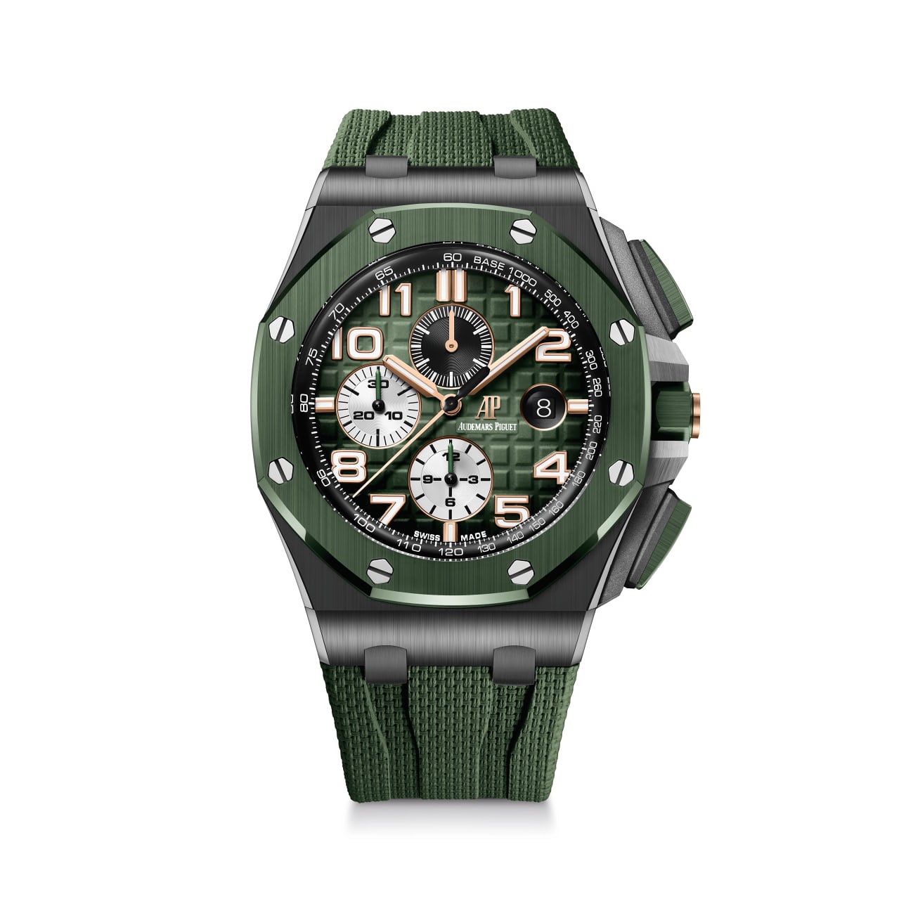 Let’s go over the appearance first, as this is undoubtedly what causes the most controversy with these timepieces. As I mentioned, the new coloured collection is based on the 44mm Royal Oak Offshore Chronograph, and each model has a black ceramic case. Offshores are pretty much the archetypical oversized sports watches, and the 44mm version is the most extreme of the standard range. The standard 42mm models “wear larger” than their dimensions suggest, that is, they appear to be larger on the wrist than other watches that are also 42mm in diameter. On average, a 42mm Offshore wears like a 44mm-45mm watch, and these 44mm watches with their enormous pushers wear more like a 48mm piece. That means you need some serious wrists to pull these off.