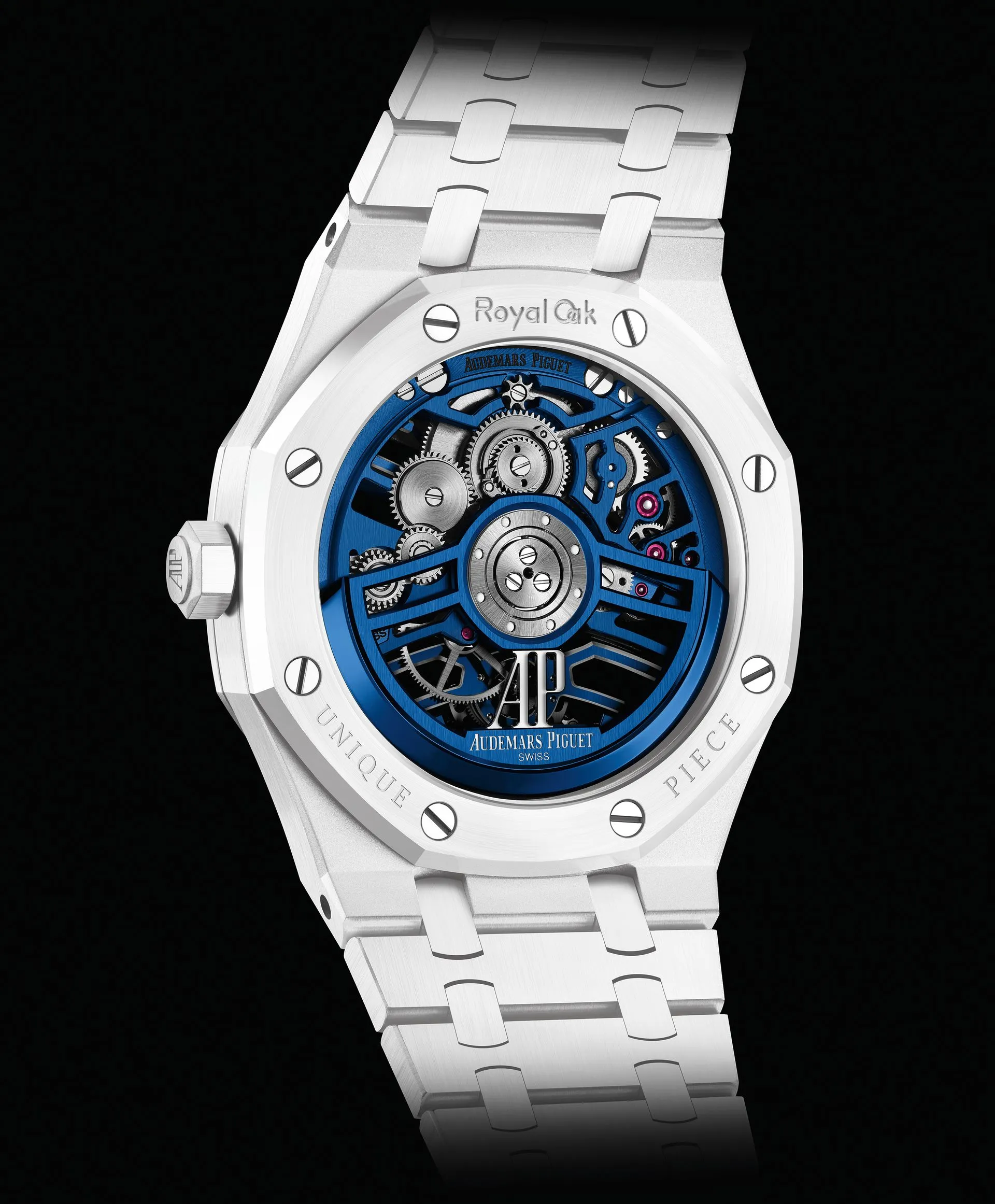 Beneath the mesmerizing exterior lies the beating heart of the watch—the Calibre 2972, an automatic movement with a 65-hour power reserve. It is fitted with a white ceramic bracelet with an AP folding clasp in blackened stainless steel.