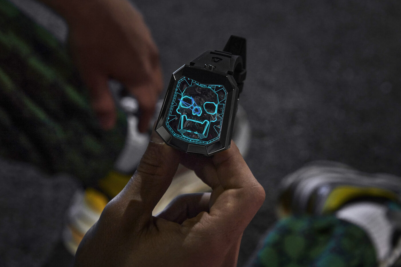The actual skull on the dial is made from pure Sapphire. It is enclosed inside a matte black DLC coated frame and according to Aventi, it’s as thick as just a grain of rice, with more edges and facets than a brilliant-cut diamond. Considered to be one of the most complex diamonds to cut, the brilliant-cut diamond has 58 facets, while the sapphire skull of this watch dial has a staggering 160 facets and 200 edges, it’s a slow, painstaking process that takes 500 hours to produce due to the material’s hardness and brittleness as well as the complexity of the shape. Pure Sapphire is one of the most challenging materials to work with, this in itself is truly a remarkable achievement for a small brand. Further upping the ante are the 7 layers of blue anti-reflective coating on the sapphire skull. The outline of the skull is treated with the highest grade Swiss-made BGW9 Super- LumiNova and along with the blue anti-reflective coating, it causes the skull to have that unique blue glow when the light catches the facets of the skull.