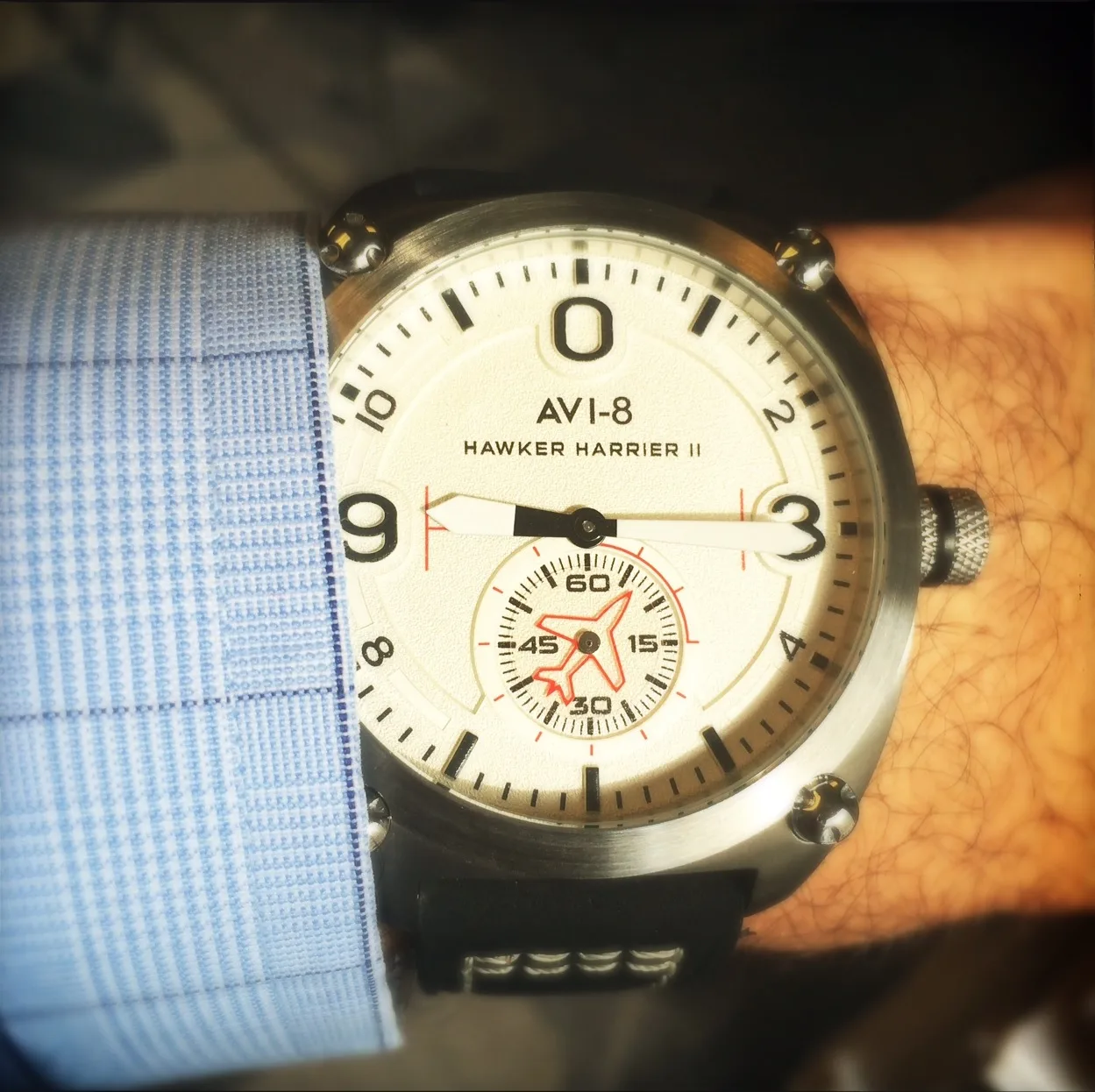 Love it or hate it, everyone knows the aircraft instrument watch. These oversized timepieces draw inspiration from cockpit gauges, with utilitarian dials and frames that mimic mounting brackets and fasteners. It is a relatively new design in the watch world. Perhaps the earliest of this type was a limited edition altimeter style watch made by Trintec Industries in 1990, but it was Bell & Ross who made the instrument watch a style icon with the BR-01 in 2005. Since then, dozens of watchmakers have produced variations on this theme. The challenge, of course, is to develop a unique design in what is a simple and nearly universally recognized style. Enter the Avi-8 Hawker Harrier II, 4026 series.