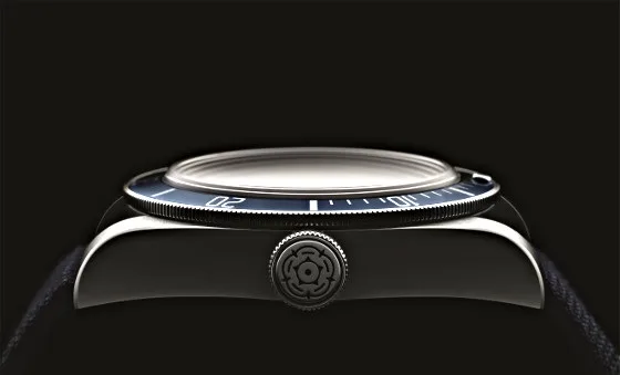 The winding crown in steel, engraved with the Tudor rose, is screwed down to guarantee water-resistance down to 200m (660 ft).