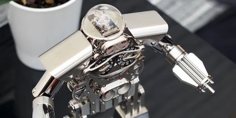 MB&F celebrated their 10-year anniversary at Baselworld 2015 with one hell of a cool release. This year’s theme was under the banner “A creative adult is a child who survived”. With such an inspirational theme, it was only fitting for MB&F to build a masterpiece to match, and match they did. Melchior was presented to us when we stopped by the MB&F booth for a sit down with the young manufacture and it felt like being a child all over again. Created with the esteemed clock mater L’Epée, the kinetic robot is a beautiful and outrageous 480-component mechanical table clock.