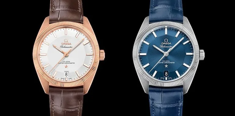 This one’s back and packing 2 different colour choice, one being what Omega calls silvery opaline. You’ll find that on the watches that come with a brown leather strap which happen to come in 18k Sedna gold, 18k yellow gold and silver. Sportier fans don’t worry either, because there’s a blue sunburst dial that comes with the bracelet steel and two tone versions, but a cool blue leather strap is a choice too.