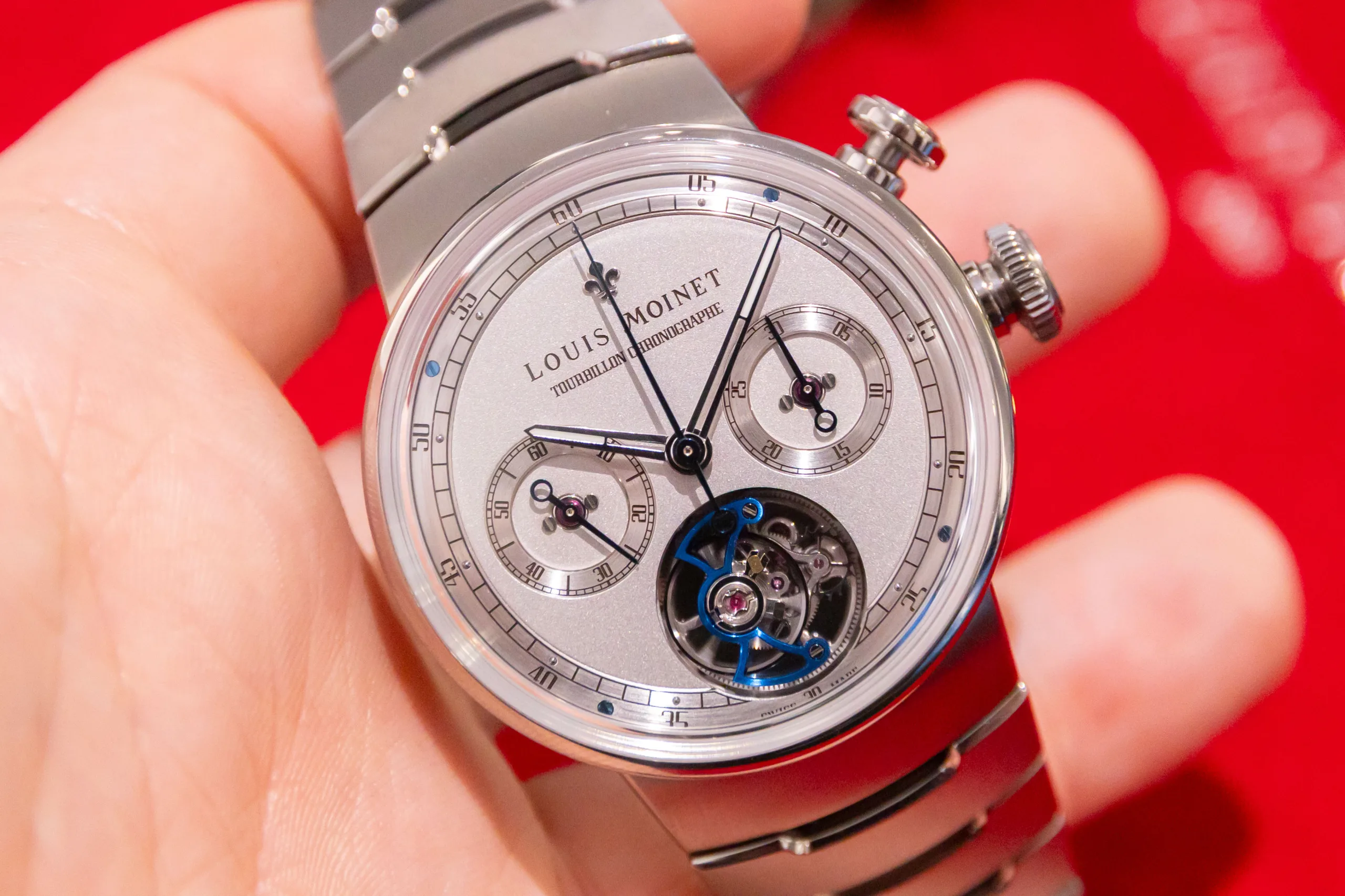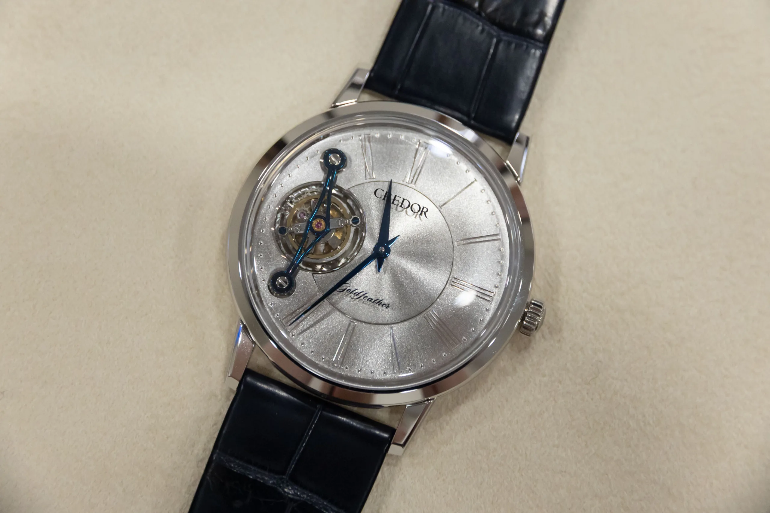 What immediately jumps out at you is the fact that the face features one distinct different to most other wristwatches on the market. It features a single blued steel hand that extends across its entire diameter of the dial. What this does is provide a backdrop for the beautiful optical effect of 2 superimposed topping tool motifs, the Speake-Marin logo, rotating at different speeds. Counter-balanced at one end by a pointer and at the other by an arc, it is a very unique way of telling time and works like a compass that works in five-minute graduations around the peripheral chapter ring. It’s a really beautiful way of telling time even if it’s not the most accurate in the world.