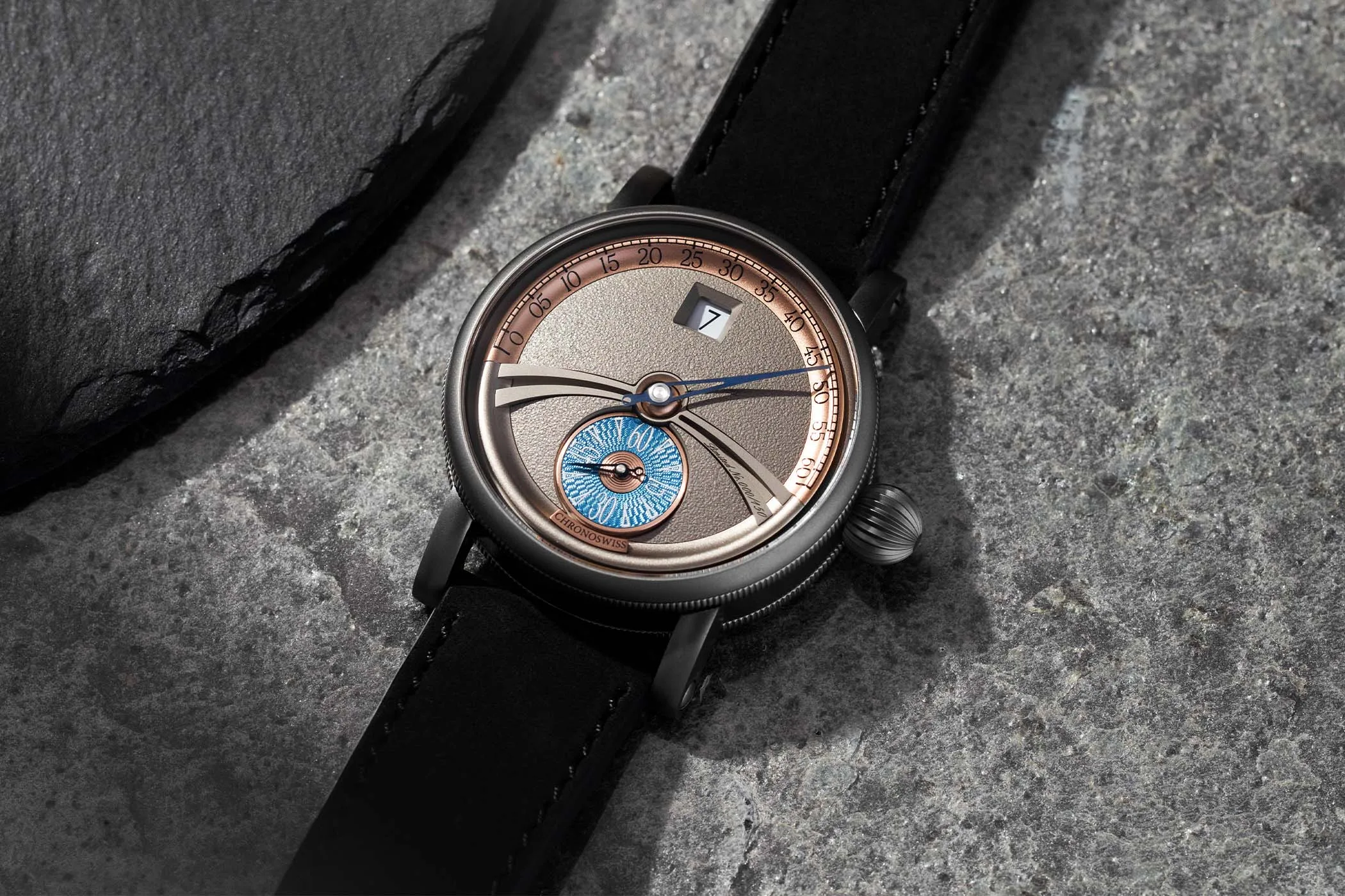 However, before we get too technical, what inspired the name Velsheda you might ask? Well as we found out by Peter himself, the name Velsheda is nautically inspired and is named after the “J Class” yacht that was built-in the 1930’s as a racing boat that is still raced to this day. The timepiece is obviously inspired by the high seas and the Piccadilly case works wonders in tying the entire theme together. Measuring in at 42mm in diameter, the 18 carat pink gold case features 2 crown positions: hand winding and stop-seconds. The dial with its unique single blued hand is finished with a stunning multi-layered lacquer dial with tapered Roman numerals and peripheral chapter ring. Anti-reflective sapphire crystal is utilized for both the front of the dial and the display caseback to view the beautiful heartbeat.