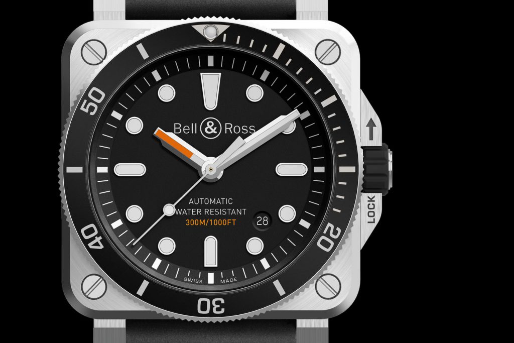 Moreover, the iconic square case of the BR collection also features a unidirectional rotating bezel with a classic 60-minute diving scale. This bezel is then screwed down to offer more water resistance for the case. The crown also sports a guard that effectively protects against impacts specially during the dive.