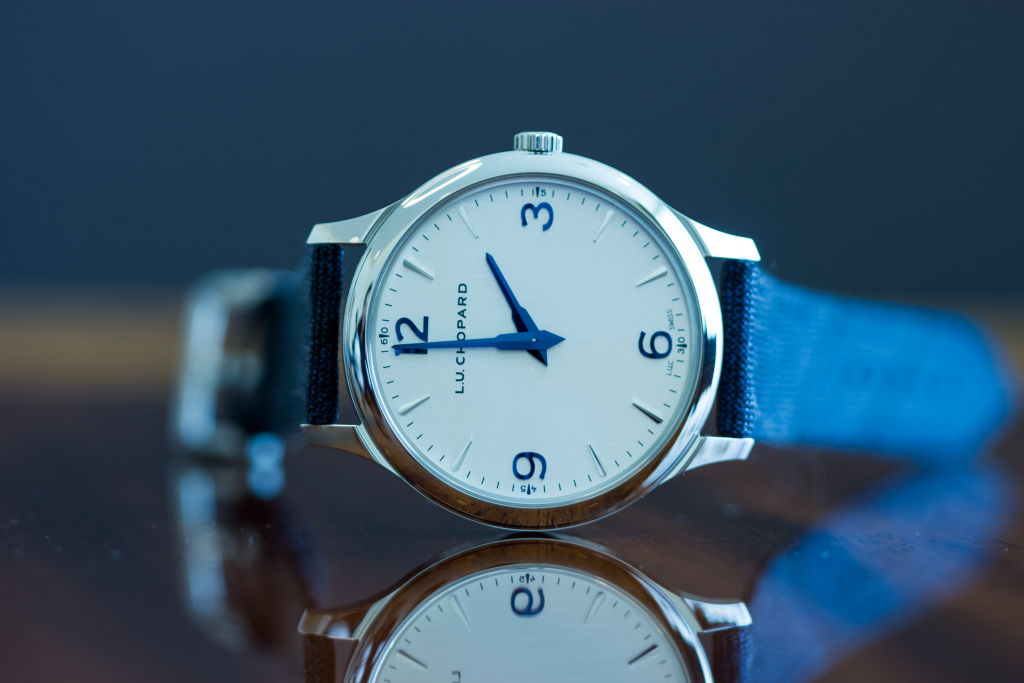 It’s a simple two-handed steel dress watch. The colours are impressive and fit very well with this, with blue hands and numerals, as well as quarter hour markers and the minute track squeezed in next to the bezel. Because only 3, 6, 9 and 12 are written on the dial in blue, the watch isn’t too overbearing. In-between those numerals are dauphine style hour markers with a silvered finish, a subtle contrast to the blued dauphine hands and numbers but one that adds to the overall style. The dial itself has a Dacron style finish to it, with the Chopard headquarters in Geneva being just down the road from the DuPont (the trademark owners of Dacron) building one must wonder whether some collaboration went on there. Either way, material effect dials that aren’t something ridiculous like leather or oak or some such are really interesting to see. It’s good to have the material effect without necessarily having to worry about the material on the dial ageing.