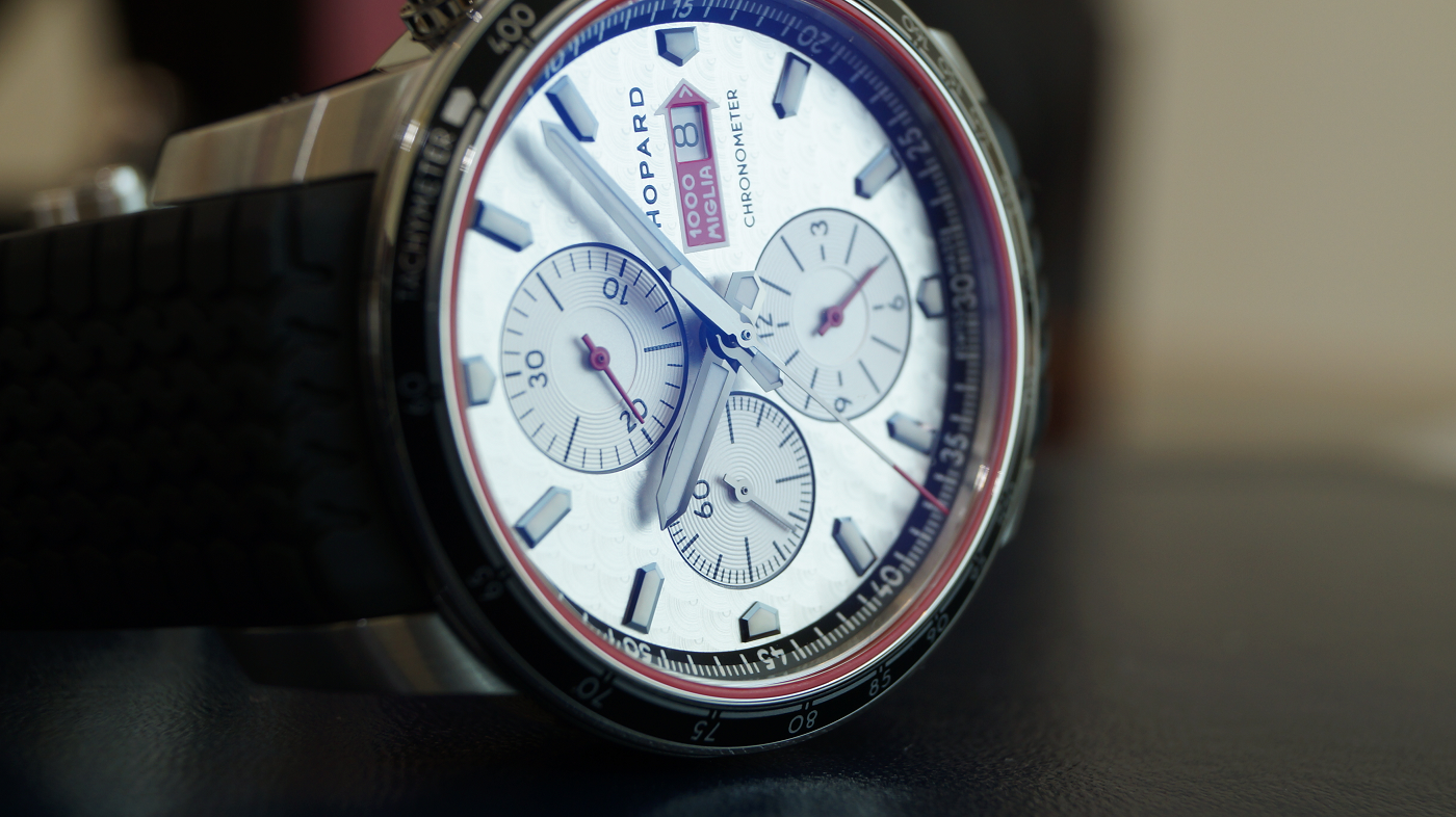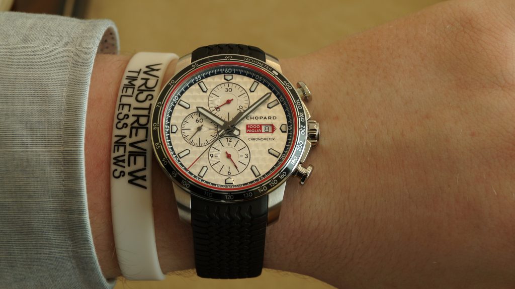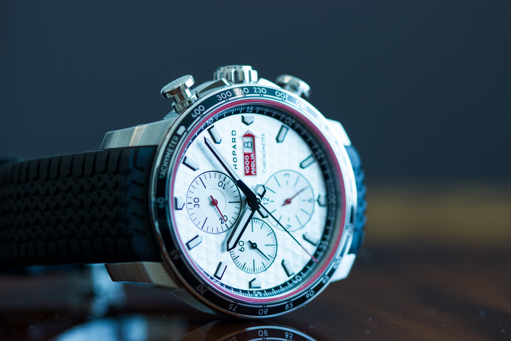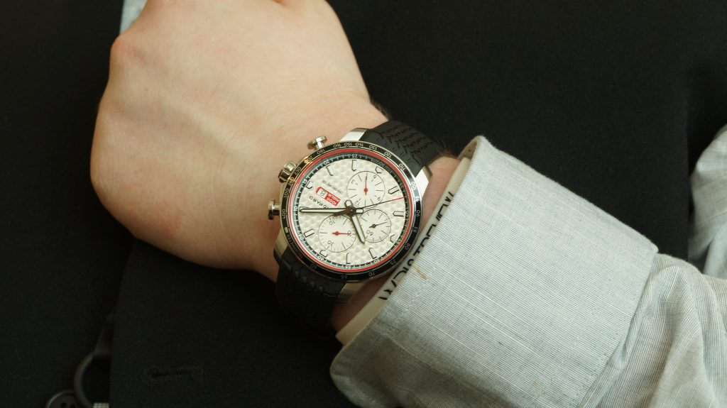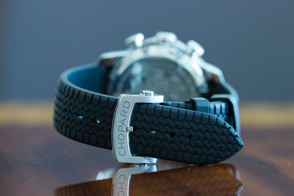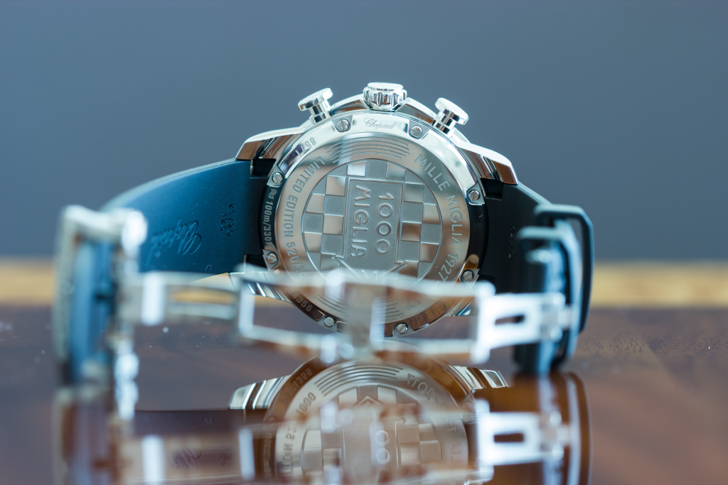 The movement isn’t visible, however, it’s been hidden behind a decorated caseback inscribed with the Mille Miglia logo and chequered race flags to give it a sportier feel. The movement inside the watch is not an ETA based one you’ll be glad to hear, what would otherwise be a deal breaker for some. Yes, the rumours are true that Chopard is doing all it can to take all of its watches away from outsourced movements and this can only increase people’s opinion of the company. Each ‘engine’ has been tested by COSC to ensure a chronometer level of accuracy, without the chronograph running the movement will run for 48 hours. Being family run and independent, these sort of things matter more to Mr. and Mrs. Sheufele than big corporations like Swatch and Richemont.